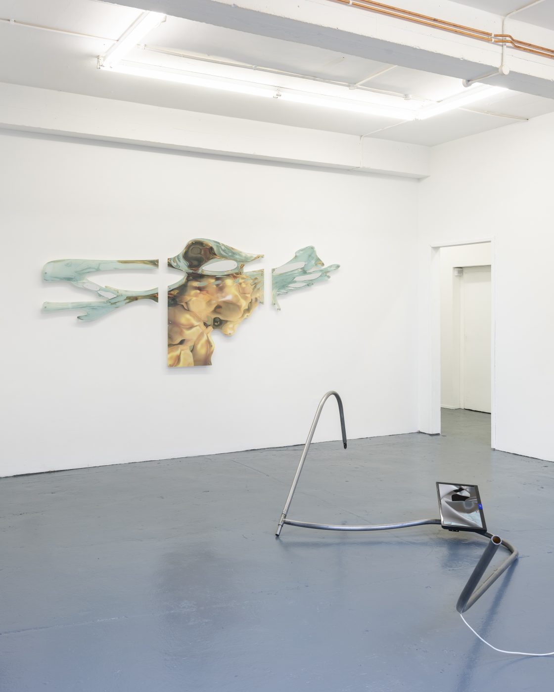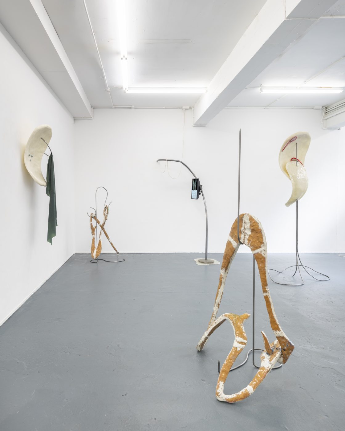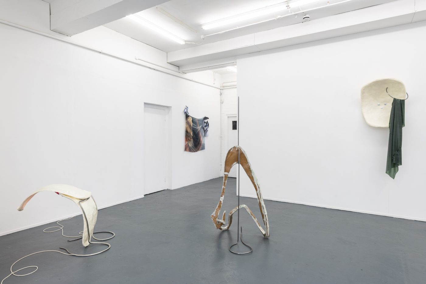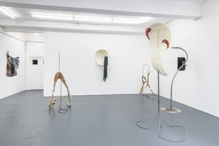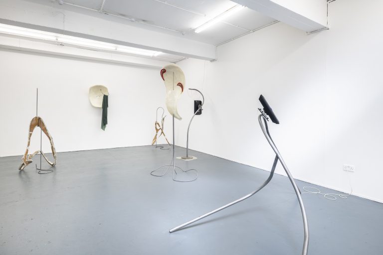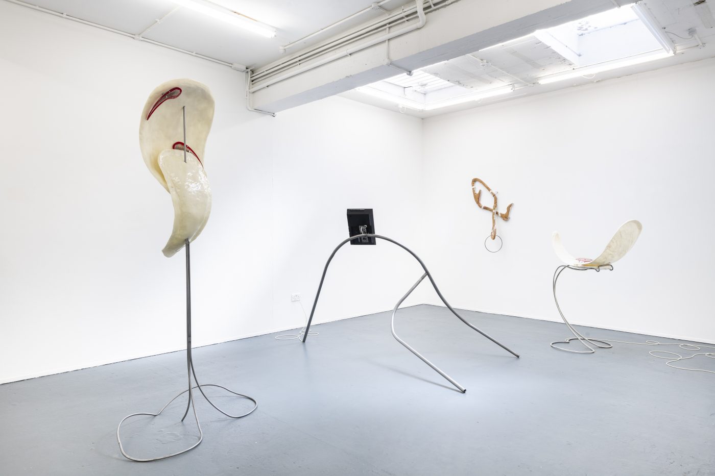 Fasse’s sculptural works displayed in the exhibition, Body (B 1 – 4) were created from the same steel poles, a non-literal reinterpretation from the performers’ tensions within their body movements, although instead of slick flat screen TVs, Fasse’s metal structures carry thermoformed wood sculptures covered with resin, hanging taught and stretched akin to the skin wrapped around the bones of a body. Here the sculptures continue to represent a physical body, although rather than facilitating a digital representation we encounter an intensely physical one that draws attention to our own bodies fragility. However, the creation of the sculptures is anything but fragile. The wood is first vacuum formed, then the silicone is poured and fitted around the sculpture using 3D moulds and clamps, with the silicone material being forced into a skeleton like framework to create the synthetic skin, constrained within its creators cage. The moulds are then taken away, revealing the original shaped wood accompanied by coloured resin and hair follicles, transforming into a relic like form.