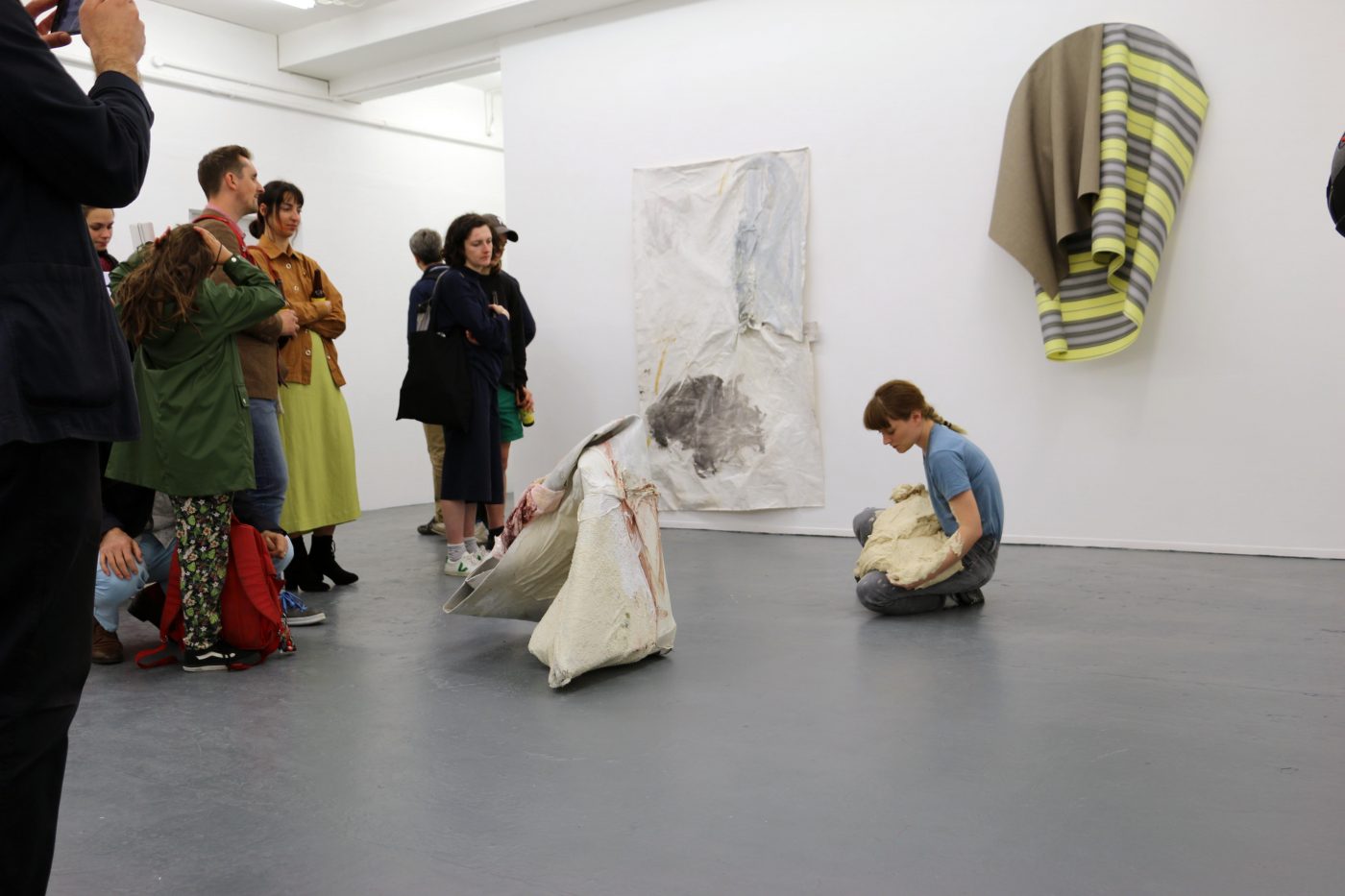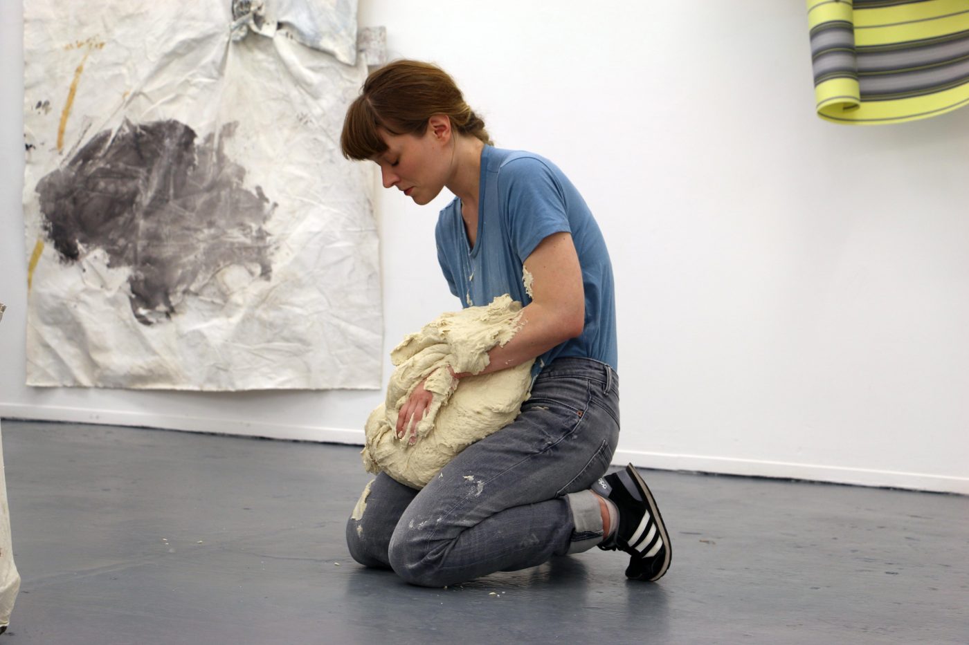 Originally composed as a video work in 2017, the live version of With Inordinate Heaviness is conceived as a response to As a butterfly folded in a caterpillar that will soon unfold – NICOLETTI contemporary’s current group exhibition that explores contemporary manifestations of the fold in sculpture, painting and photography. The performance reflects Wilson’s ongoing research on the materiality of dough and its relationship to the human body through movement and dance. Consisting of a single performer caressing and manipulating an elastic mass of fresh dough, With Inordinate Heaviness explores the heteromorphism of two living organisms, both taken in a slow but constant flow of movement engendered by the action of the other. The malleability of dough, generating ever-changing pleats and creases, evokes the folds and wrinkles of the human skin while driving the body into multiple contortions. Folded upon each other, simultaneously revealing and concealing their parts, the body and the dough enter in a graceful dance choreographed by gravity, interweaving presence and absence, materiality and memory through an interplay of sinuous gestures.