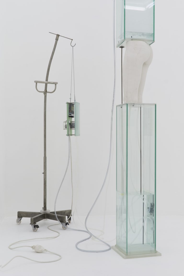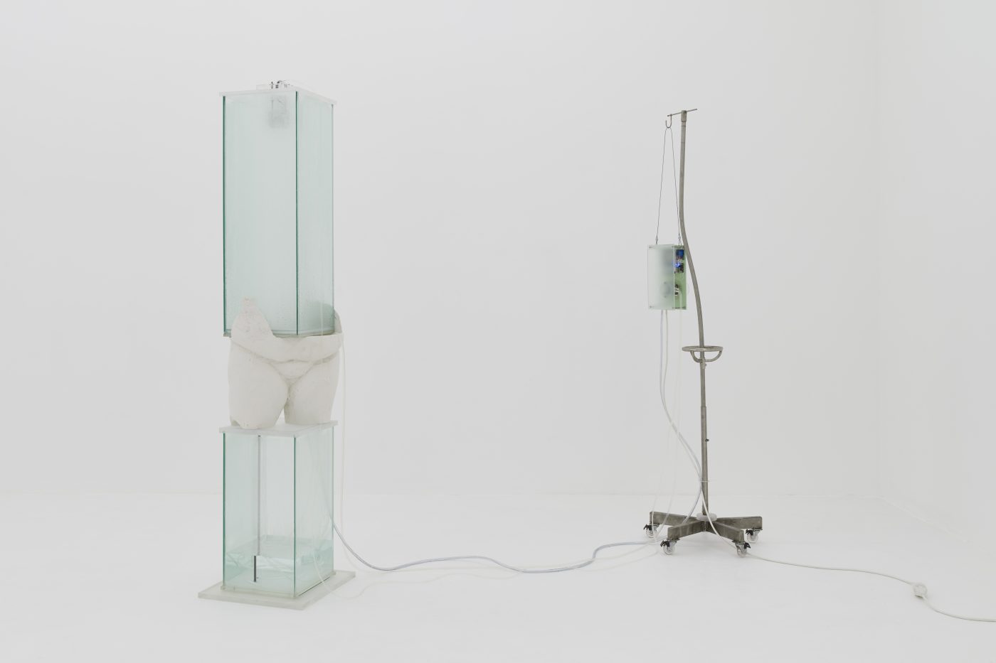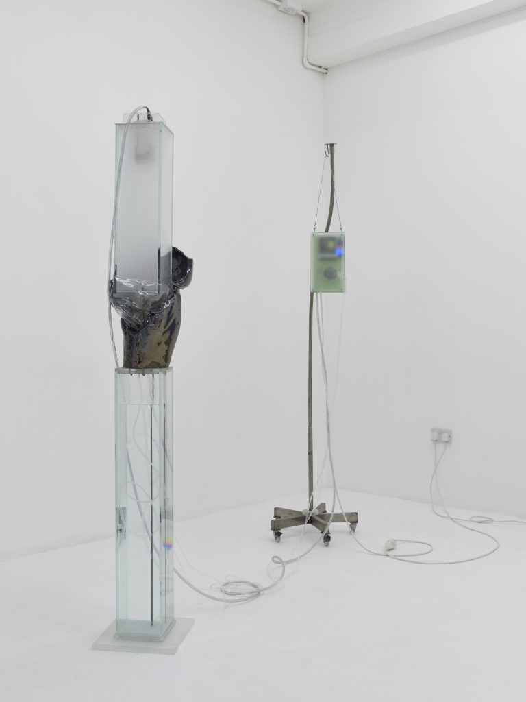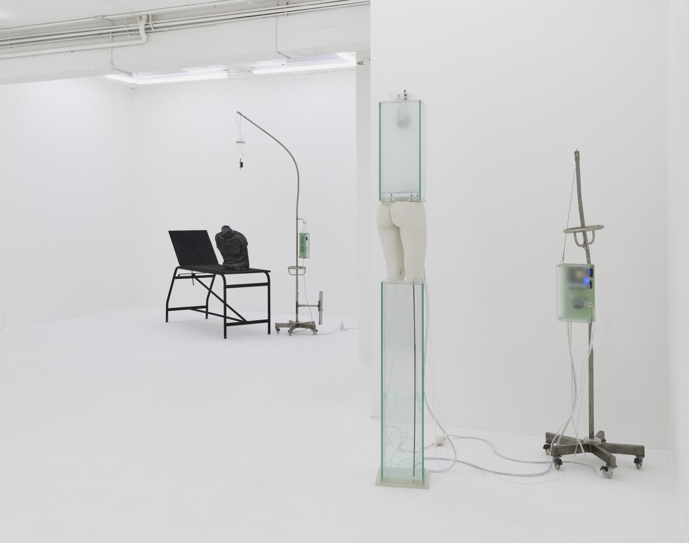 At NıCOLETTı, Servanin coupled his Géants to IV stands on which he affixed computers designed to monitor a mechanical system distributing water in and out of their bodies. These computers are also sending ultrasounds that transform water into a fog floating within the sculptures. Another Géant, made of clay and displayed on a bed, is connected to a system distributing water on its surface, which will slowly melt throughout the exhibition. With these works, Servanin implements a process of exchange between bodies, machines and computer engineering – a posthuman ballet evoking both the medical assistance of living beings and the artificial recreation of organic life by technological devices.