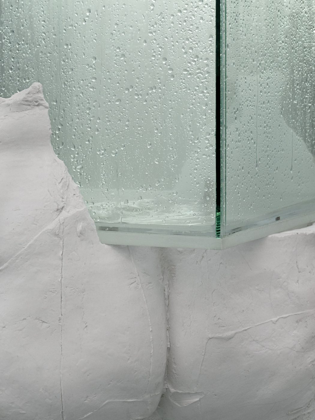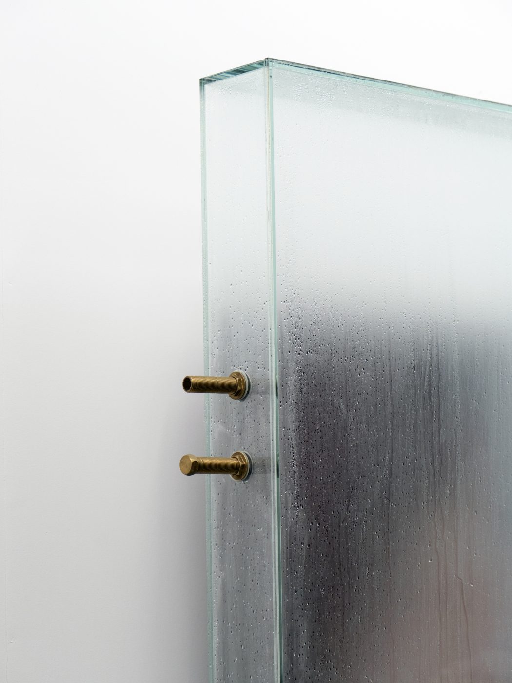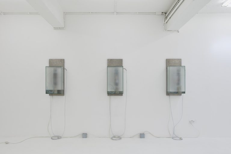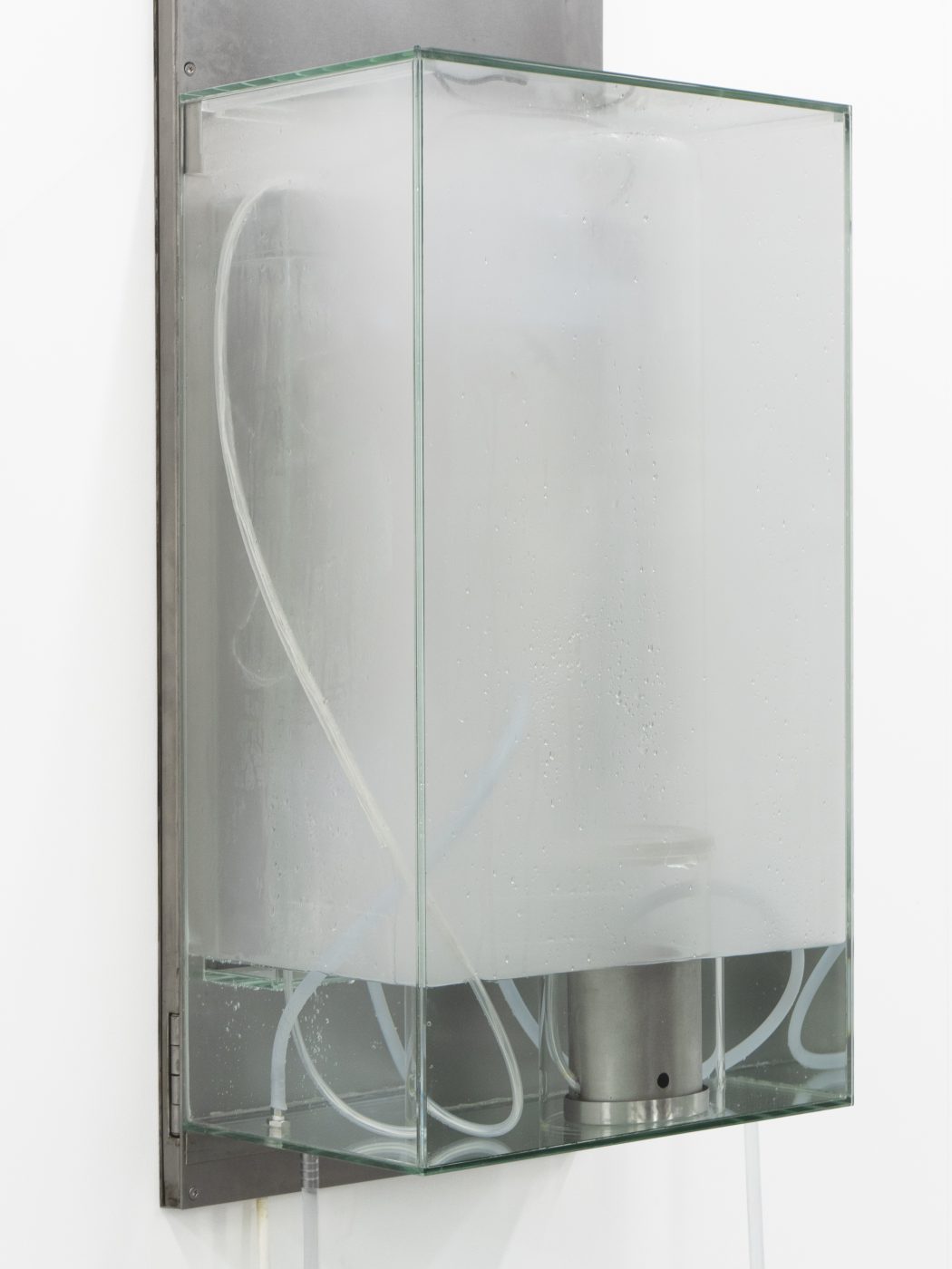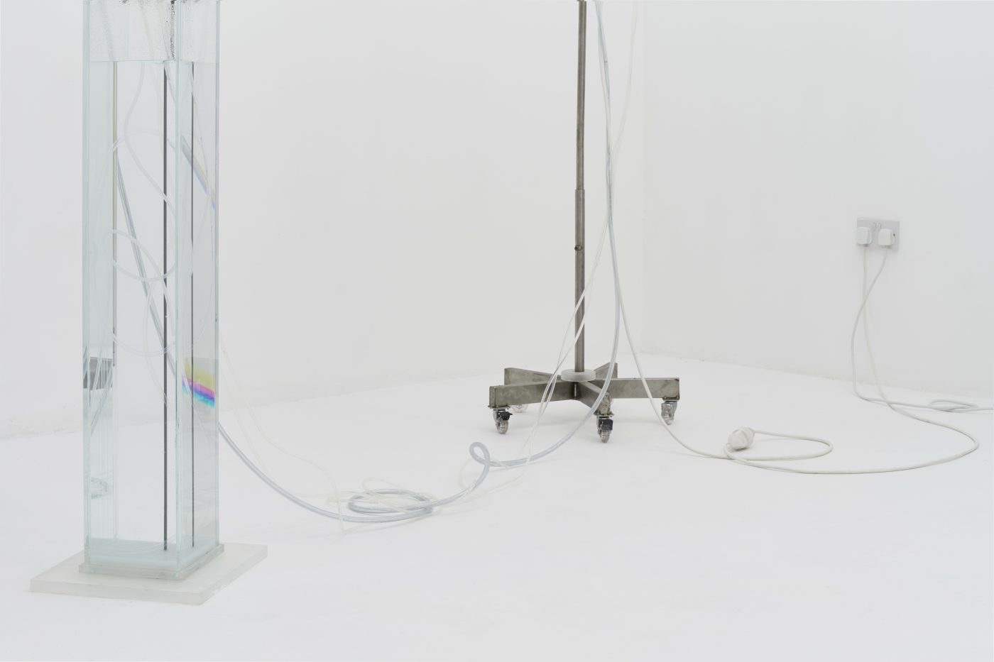 At NıCOLETTı, Servanin coupled his Géants to IV stands on which he affixed computers designed to monitor a mechanical system distributing water in and out of their bodies. These computers are also sending ultrasounds that transform water into a fog floating within the sculptures. Another Géant, made of clay and displayed on a bed, is connected to a system distributing water on its surface, which will slowly melt throughout the exhibition. With these works, Servanin implements a process of exchange between bodies, machines and computer engineering – a posthuman ballet evoking both the medical assistance of living beings and the artificial recreation of organic life by technological devices.