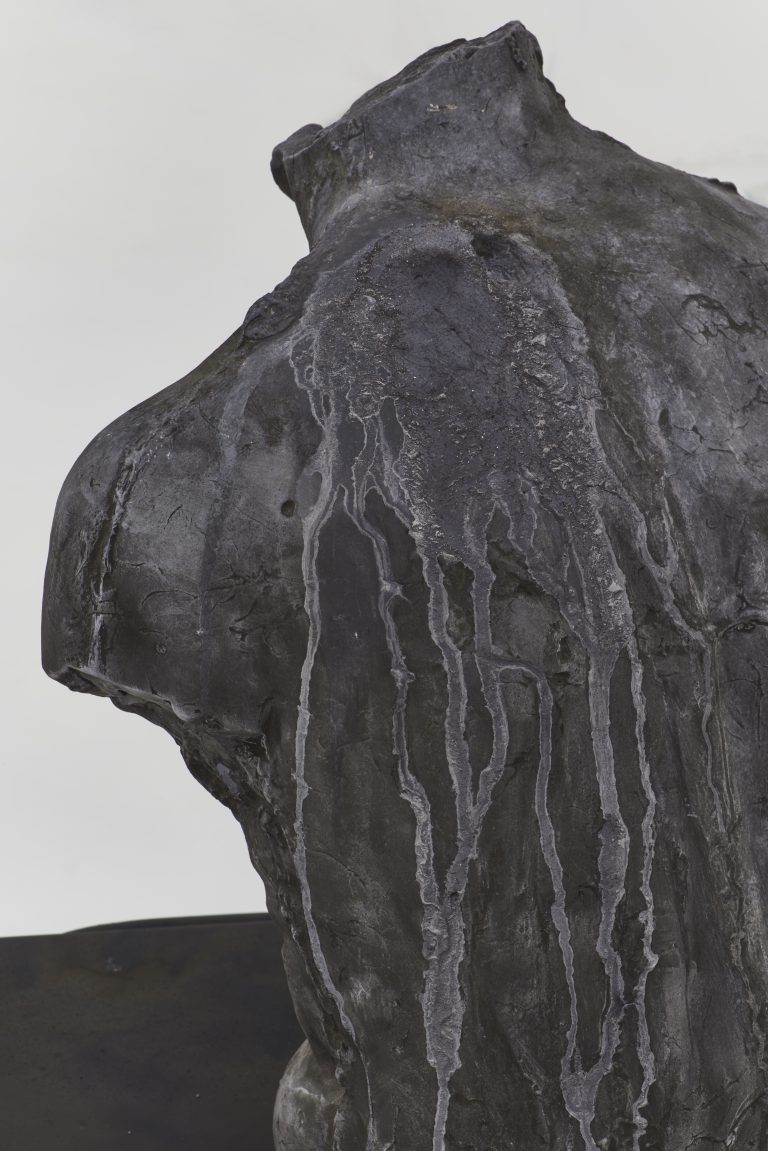 These ideas are explored through the staging of situations enacted by sculptural bodies that Servanin calls Géants [Giants] – a nod to Greek mythology, in which the Gigantes were endowed with supernatural powers. Referencing the aesthetics of classical sculpture – busts or naked bodies made of clay or porcelain – Servanin’s Géants are composite beings that are firstly molded on human bodies before being combined with an array of synthetic materials and prosthetic technologies.