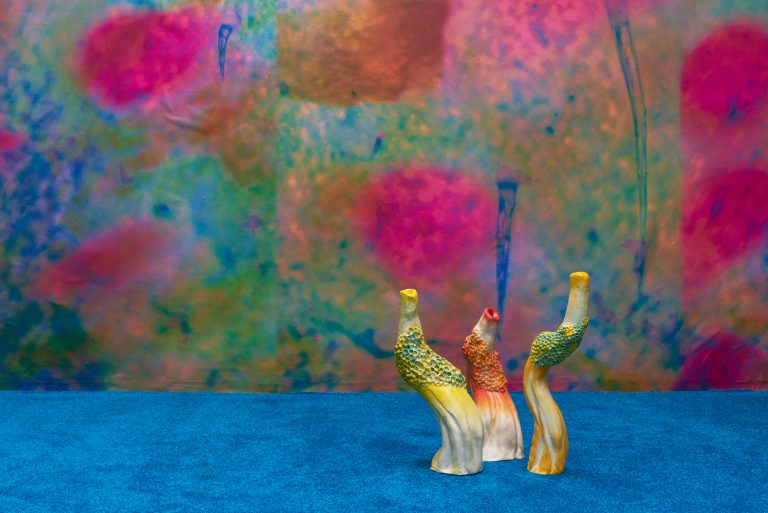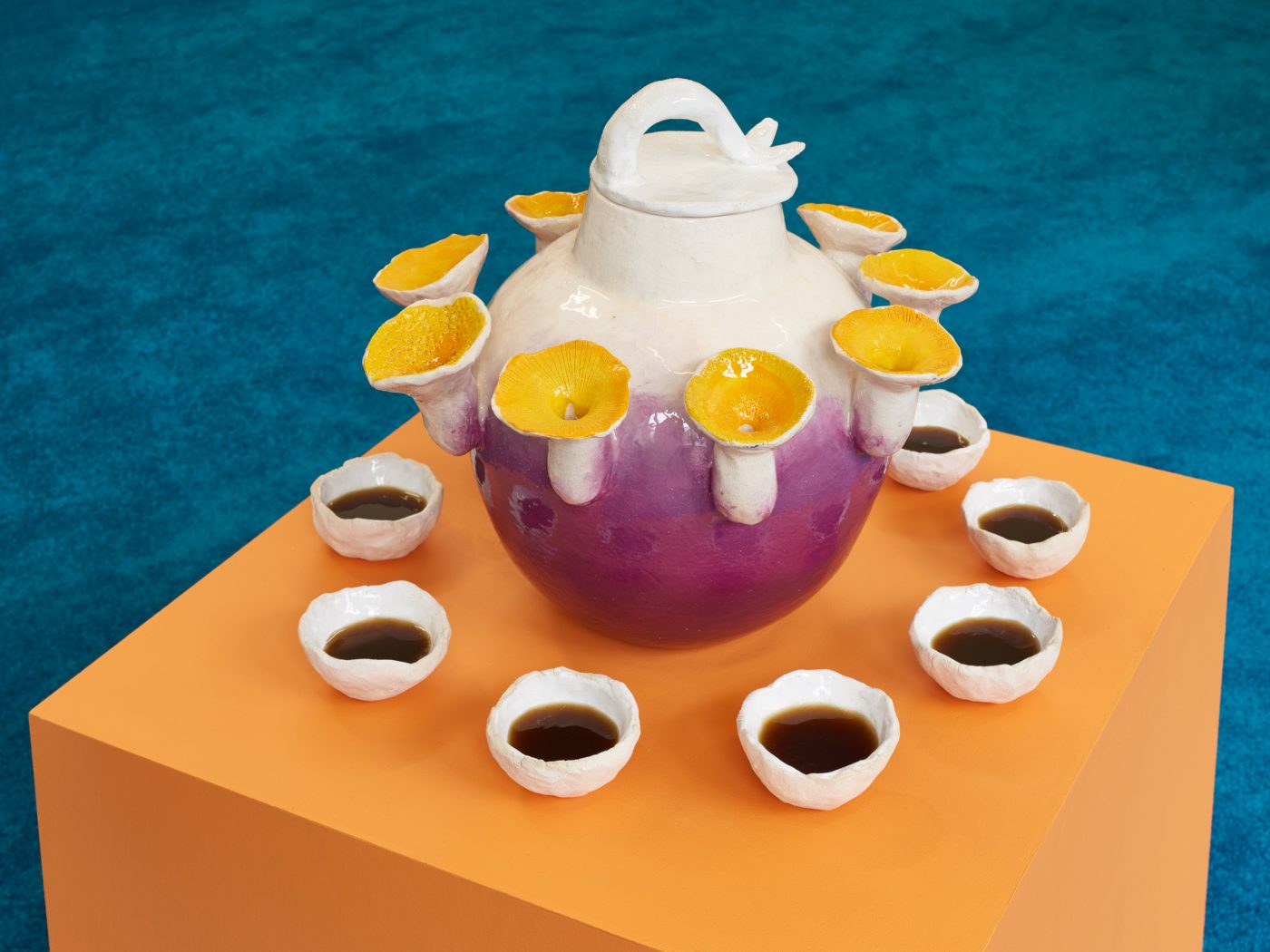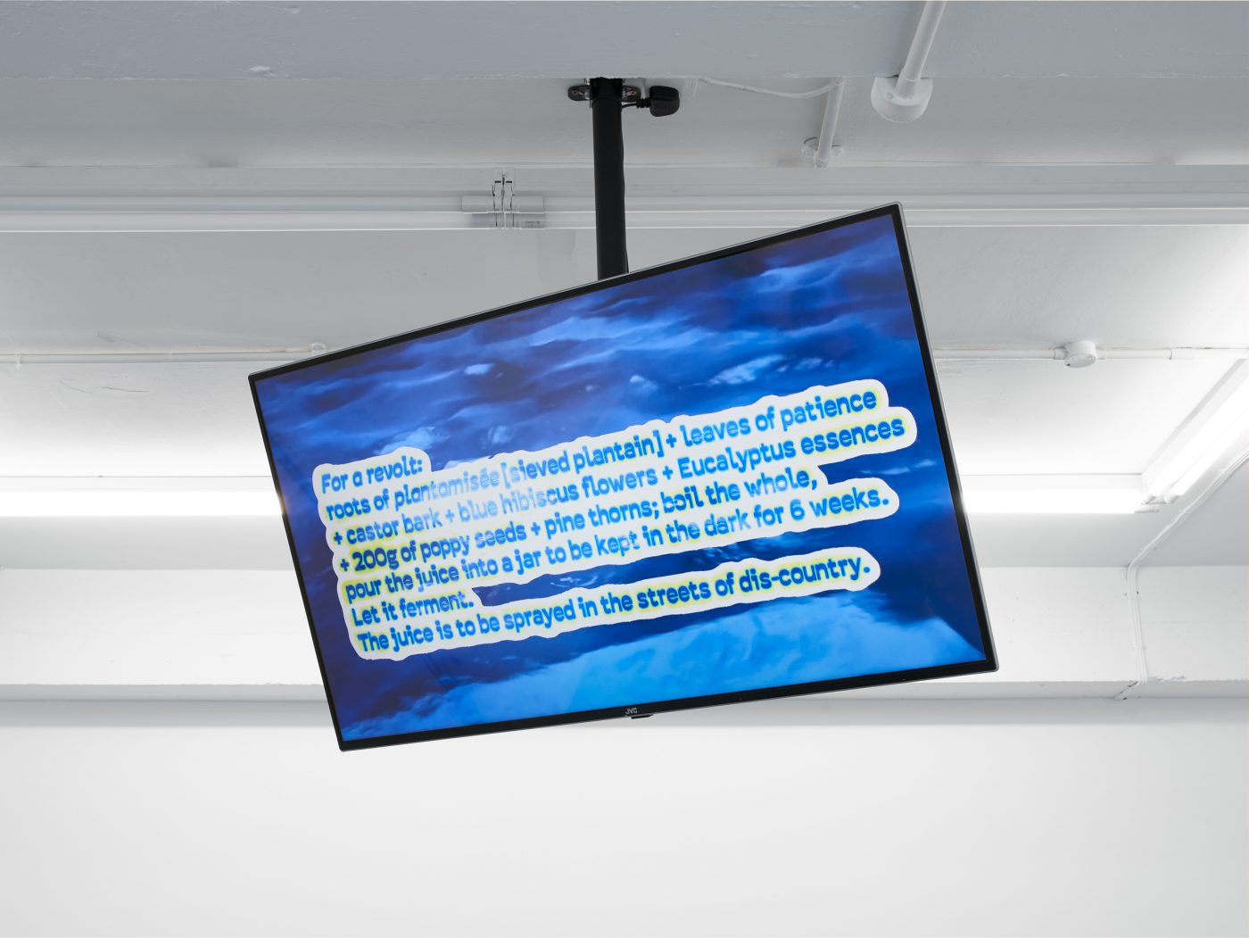 Ntjam introduces this resistance tactic through the character of Mami Wata, a voodoo figure and fish-woman divinity venerated in much of Africa. In the first room of the exhibition, Offering to Djengou (2021), a ceramic jar with nine spouts, welcomes the viewer with a selection of beverages concocted to invoke Mami Wata’s spirit and condition our bodies for future revolts. Above the sculpture, a video enumerates these potions’ recipes, listing the required ingredients to either ‘create disorder’, ‘summon our undead’, or ‘for our independence’, for which the artist recommends, for instance, a mix of ‘crushed plantamisée flower + elderflower + castor-oil branch + sunflower’, which should then be ‘applied as cataplasms on our monuments.’