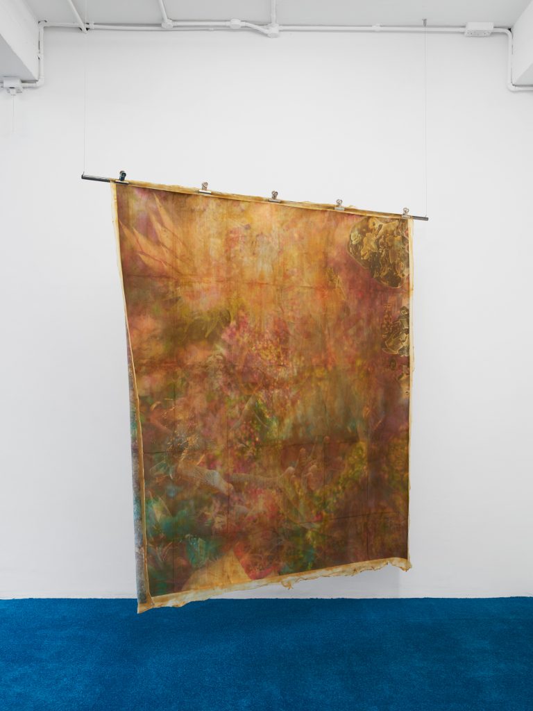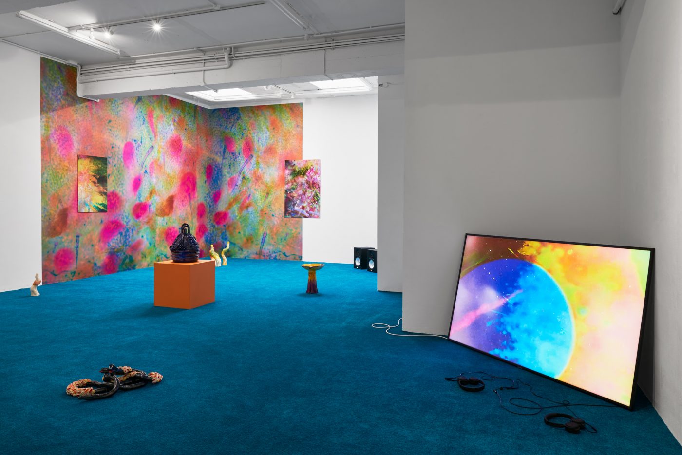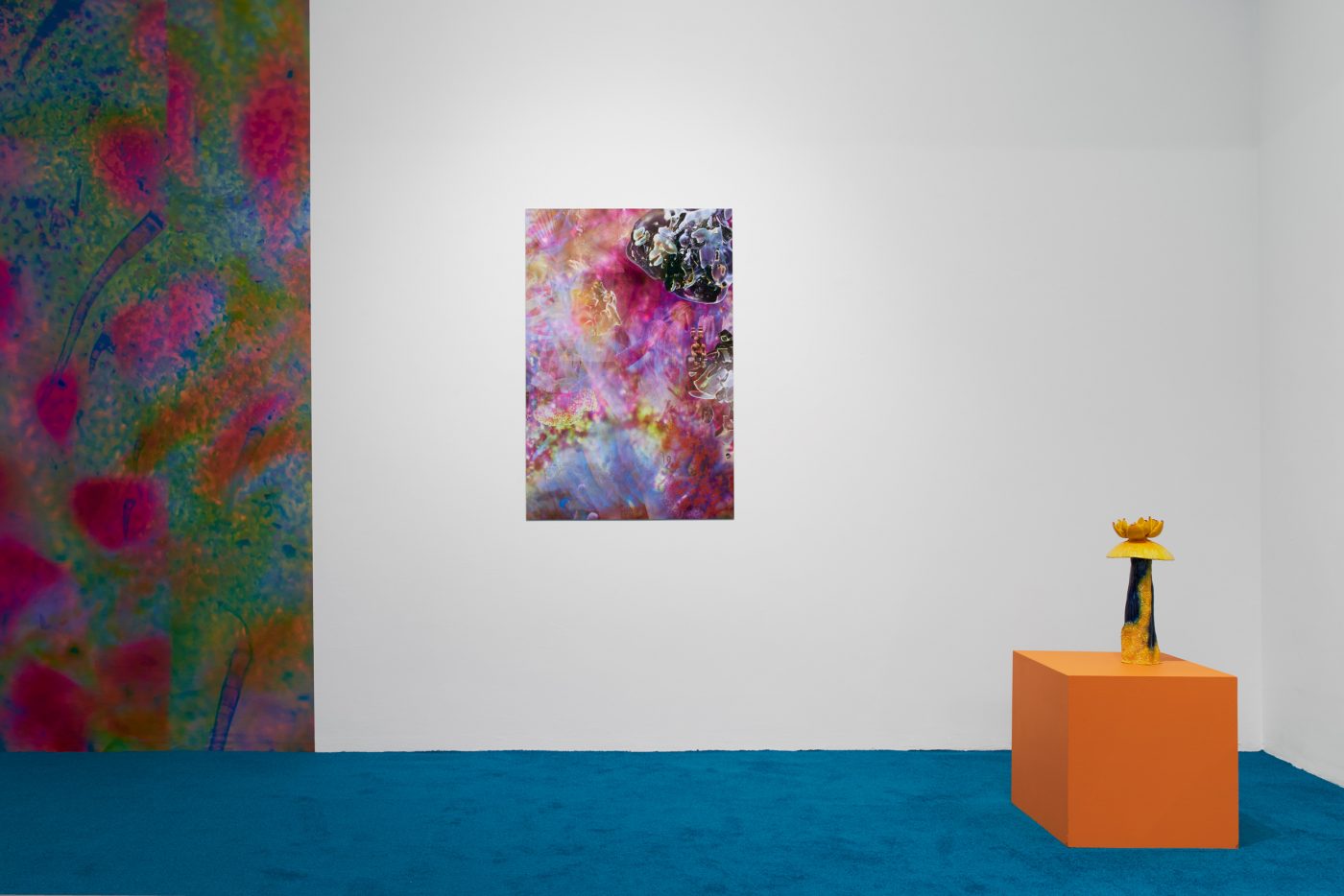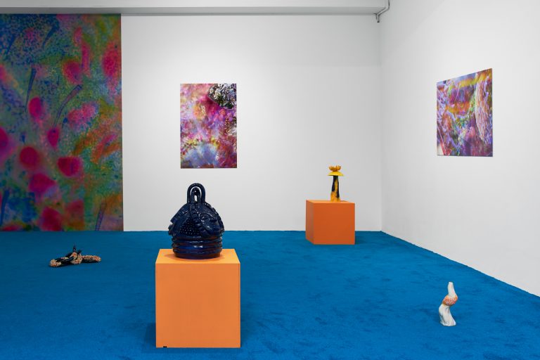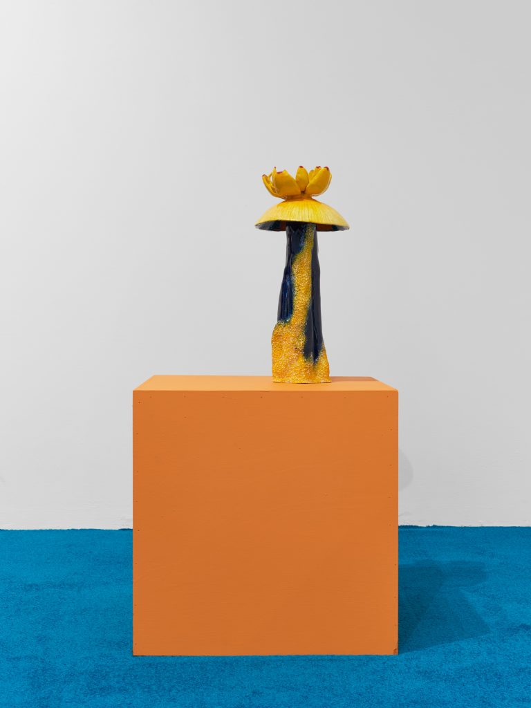 Similar ideas of fluidity and hybridity are being examined through sculptures of plants and animals, including a group of flowering mushrooms, sprawling algae, and a contorted snake called Nummo – the name of a Dogon spirit often taking the form of a hermaphroditic, fish-like creature. Questioning the categories in which scientific reasoning tends to circumscribe beings and things, Ntjam’s sculptures also allude to the techniques of camouflage, mutation and adaptation performed in nature. As she explains, ‘I often refer to plants, animals, and organic materials and substances found at a microscopic level – molecules, particles, etc. – as I’m interested in how their evolution and techniques of survival and multiplication reflect certain modes of resistance and action that have been used by minoritarian and oppressed groups of people across history.’