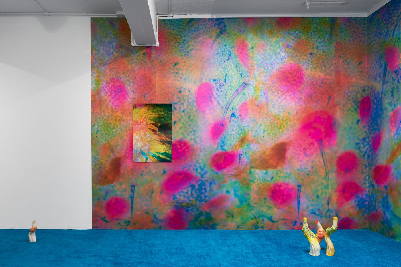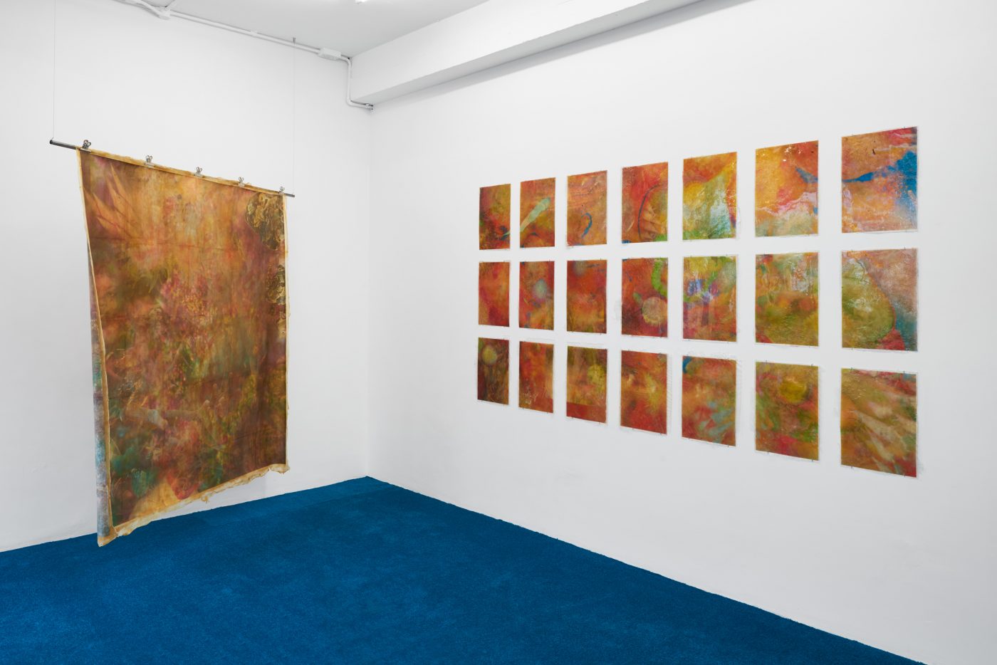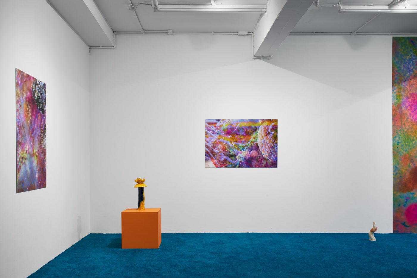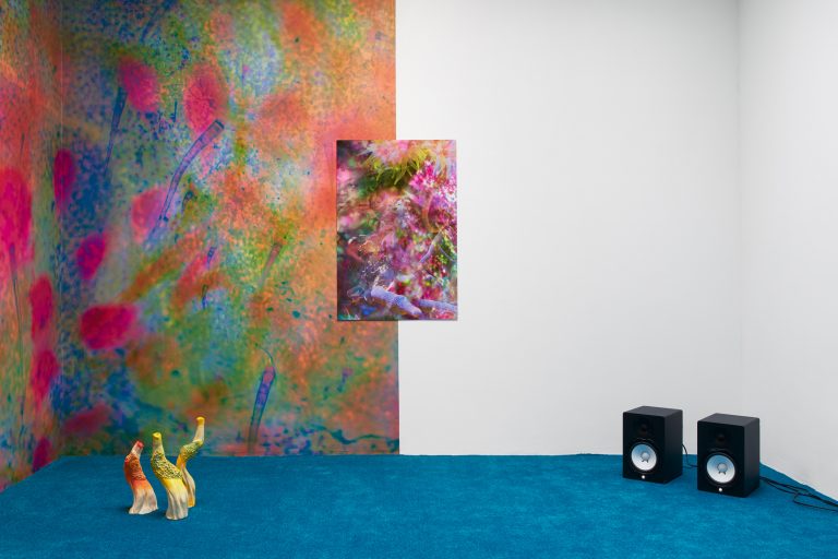 Similar ideas of fluidity and hybridity are being examined through sculptures of plants and animals, including a group of flowering mushrooms, sprawling algae, and a contorted snake called Nummo – the name of a Dogon spirit often taking the form of a hermaphroditic, fish-like creature. Questioning the categories in which scientific reasoning tends to circumscribe beings and things, Ntjam’s sculptures also allude to the techniques of camouflage, mutation and adaptation performed in nature. As she explains, ‘I often refer to plants, animals, and organic materials and substances found at a microscopic level – molecules, particles, etc. – as I’m interested in how their evolution and techniques of survival and multiplication reflect certain modes of resistance and action that have been used by minoritarian and oppressed groups of people across history.’