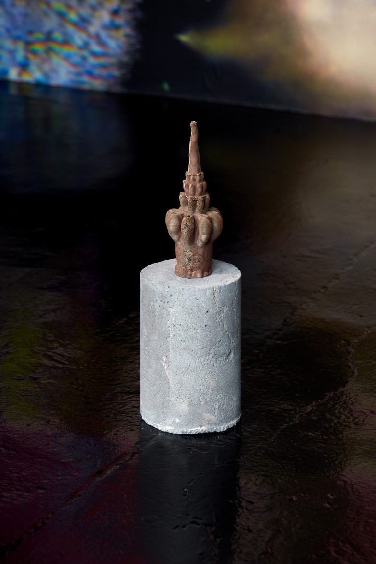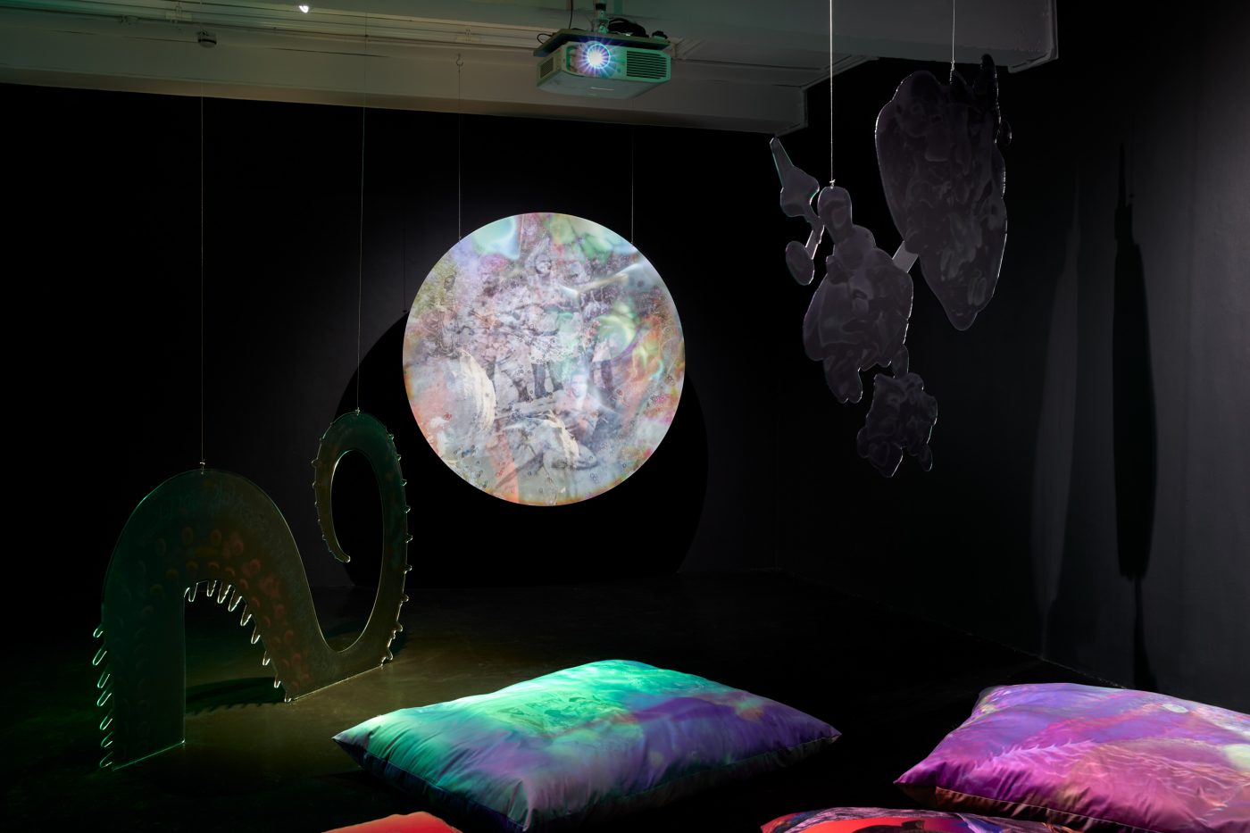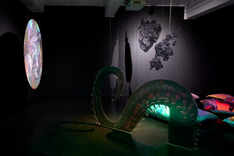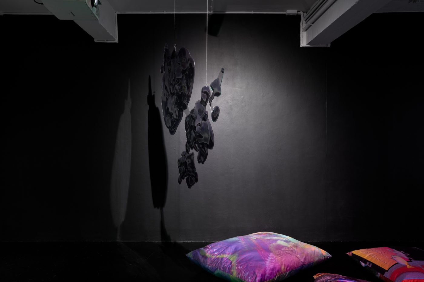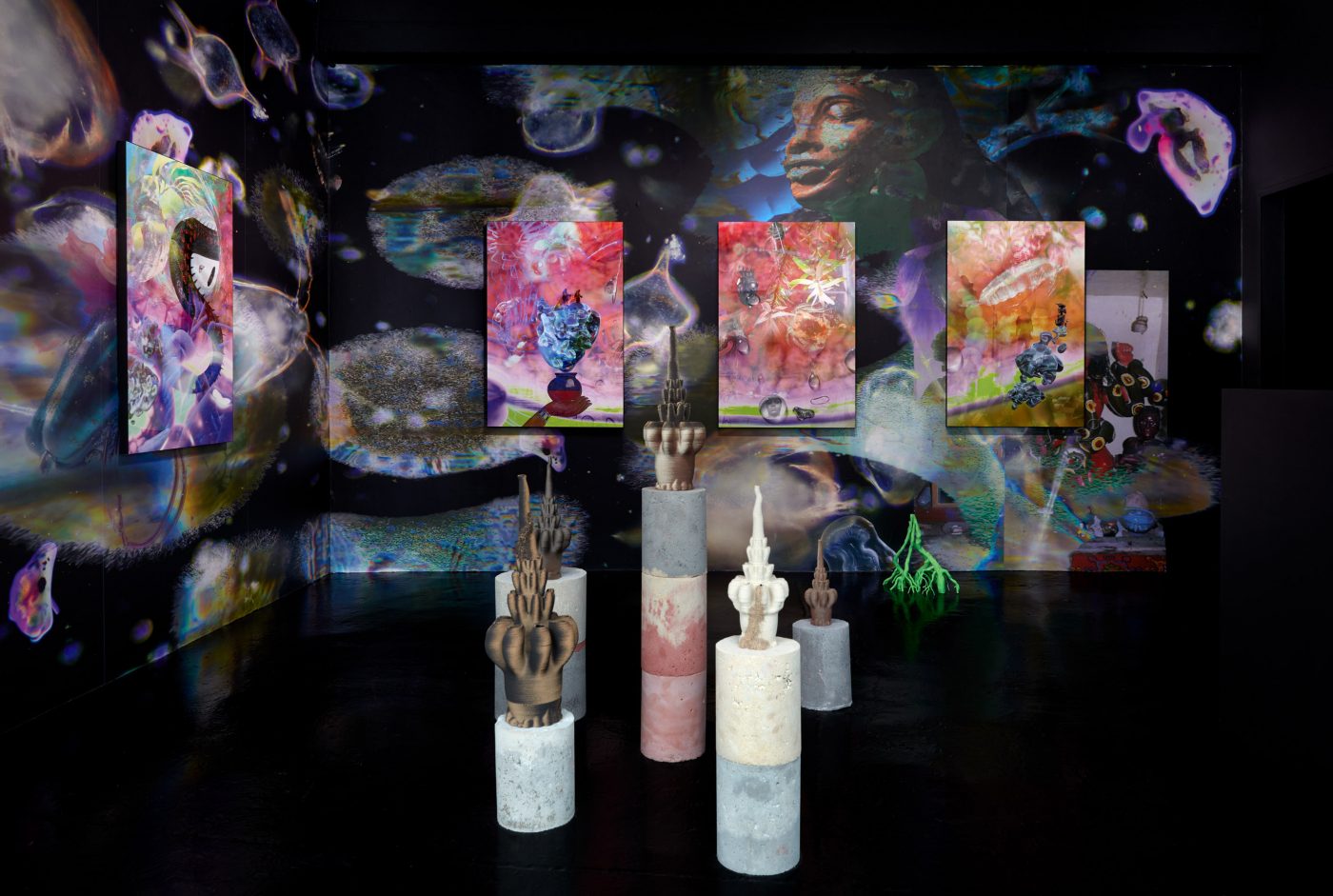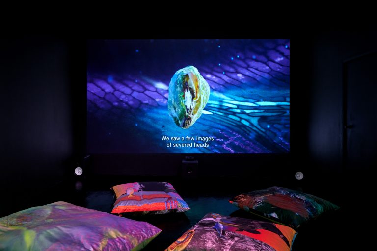 21.09.23 - 04.11.23In Limestone Memories – un maquis sous les étoiles [a maquis under the stars], her second solo exhibition at NıCOLETTı, Josèfa Ntjam continues her exploration of outer space and the abyss as spaces of resistance. Evoking the atmosphere of a cavern with black walls and floor, the exhibition centres around Dislocations (2022), a 17 min film co-produced by Palais de Tokyo, Paris, and Cincinnati Contemporary Arts Center, Cincinnati. The film tells the story of Persona, a fictional character pursuing an initiatory journey from the internet to a cave floating in outer space amongst a constellation of asteroid-like shells and fossils – a rocky soft cave, both underwater and interstellar. Projected onto the cave’s walls, the memories of warriors, activists and family members who have fought for Cameroon’s independence progressively melt with Persona, whose humanoid body eventually dissolves into aqueous particles.