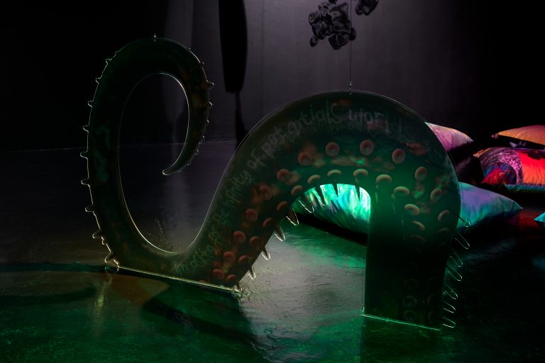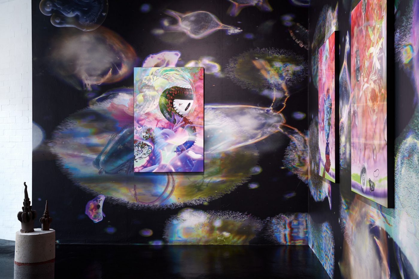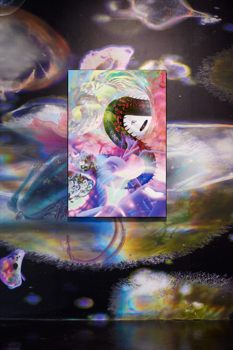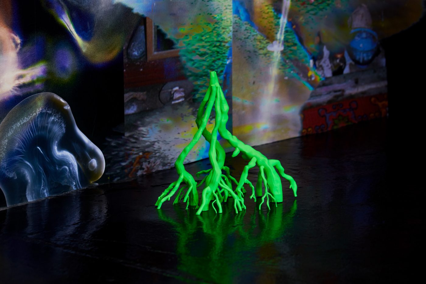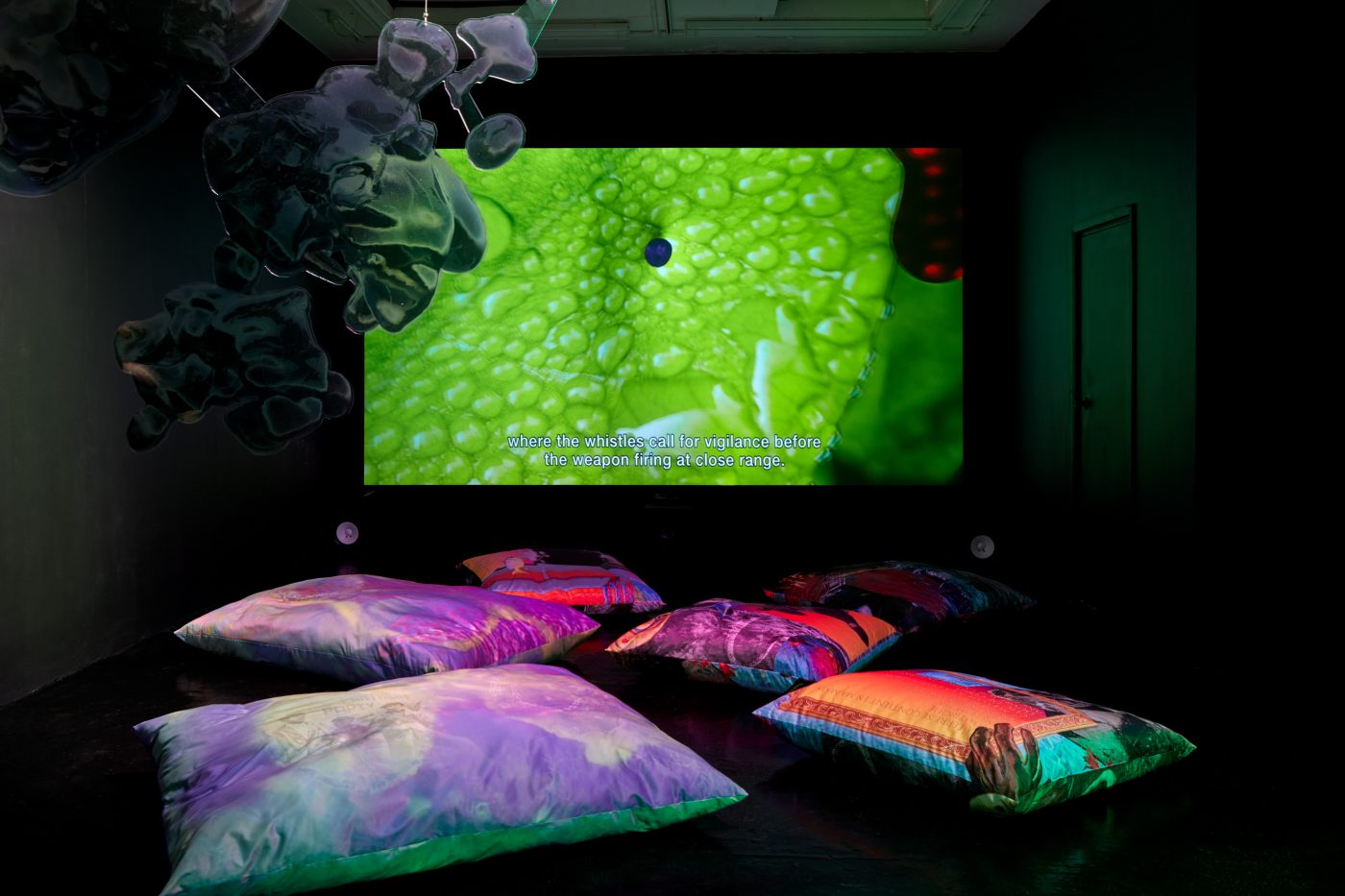 21.09.23 - 04.11.23In Limestone Memories – un maquis sous les étoiles [a maquis under the stars], her second solo exhibition at NıCOLETTı, Josèfa Ntjam continues her exploration of outer space and the abyss as spaces of resistance. Evoking the atmosphere of a cavern with black walls and floor, the exhibition centres around Dislocations (2022), a 17 min film co-produced by Palais de Tokyo, Paris, and Cincinnati Contemporary Arts Center, Cincinnati. The film tells the story of Persona, a fictional character pursuing an initiatory journey from the internet to a cave floating in outer space amongst a constellation of asteroid-like shells and fossils – a rocky soft cave, both underwater and interstellar. Projected onto the cave’s walls, the memories of warriors, activists and family members who have fought for Cameroon’s independence progressively melt with Persona, whose humanoid body eventually dissolves into aqueous particles.