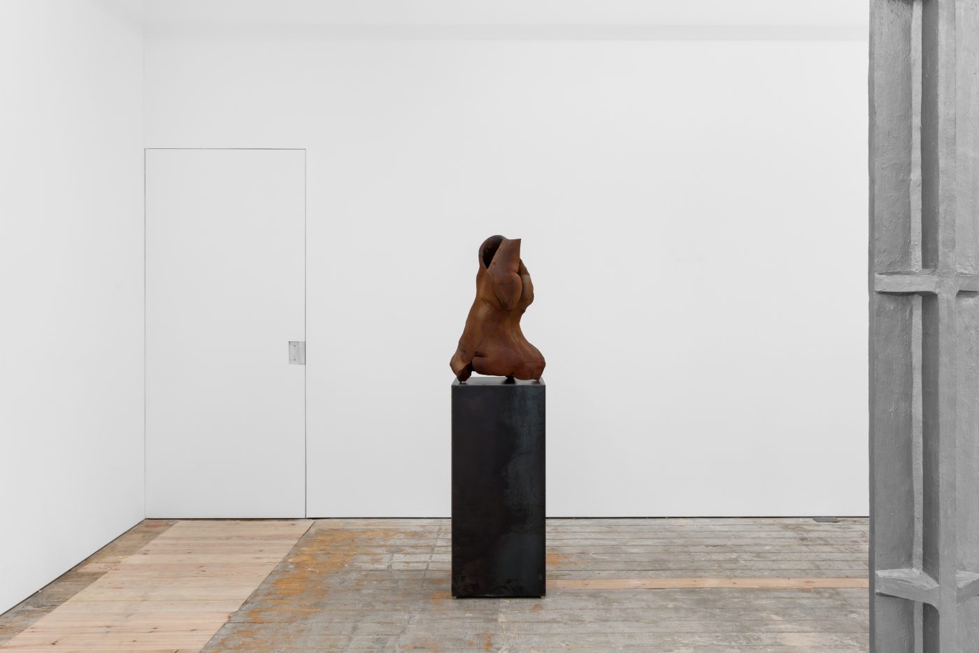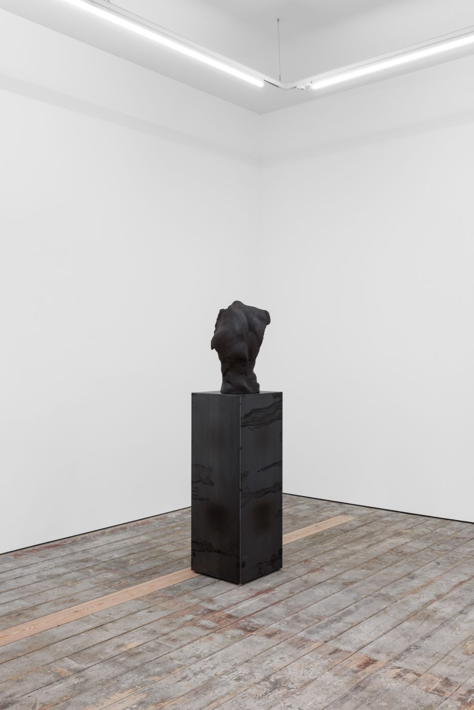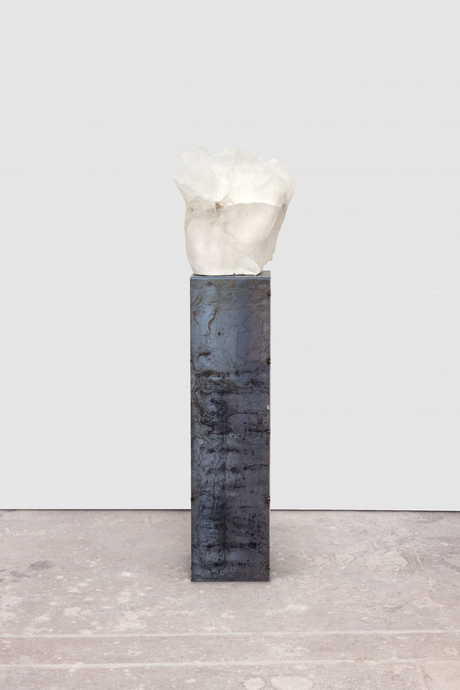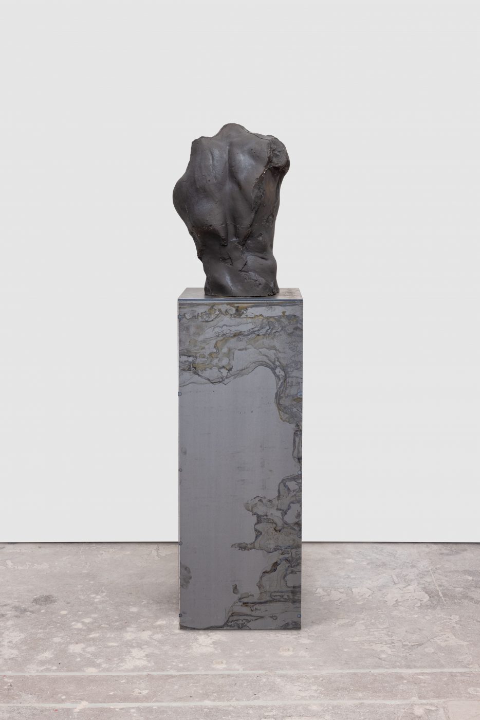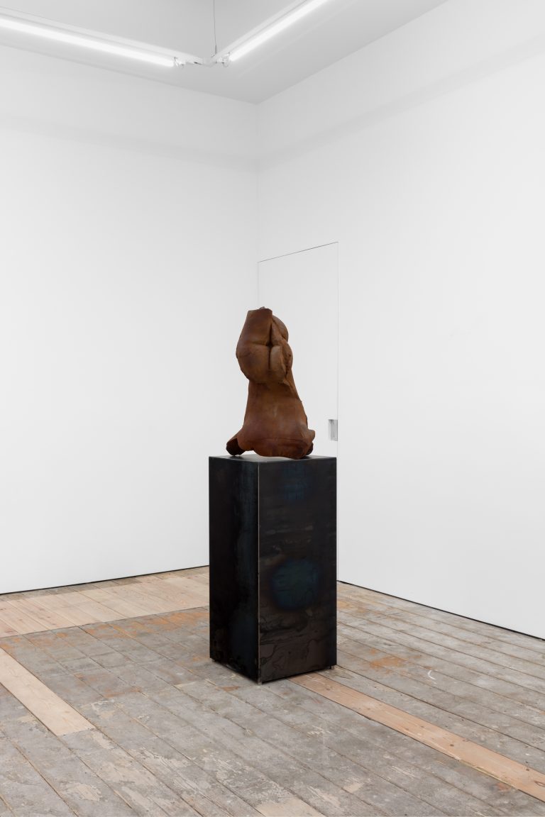 In Environment 12, Servanin removed such technological artifice from the exhibition, focusing instead on a close, intimate study of human anatomical structures. The works in this exhibition are the result of extensive casting sessions involving approximately twenty models of varying ages, genders, and body types. Through meticulous examinations of their bodies’ armatures, Servanin captures the sensual imprint of flesh upon raw matter, creating casts that are then fractured, manipulated, and reassembled to create a series of hybrid beings. Made of different materials such as glass and chamotte clay, these sculptures are then subjected to procedures of successive addition and subtraction of matter, including steel powder, acid, lampblack and water. Through this process, the artist generates fissures, folds and scars that evoke the permanent transformation of organisms, conjuring the impermanence of the human body, whose epidermis is the conduit of a constant flow of fluids that are the source of life, growth and health, but also of decay.