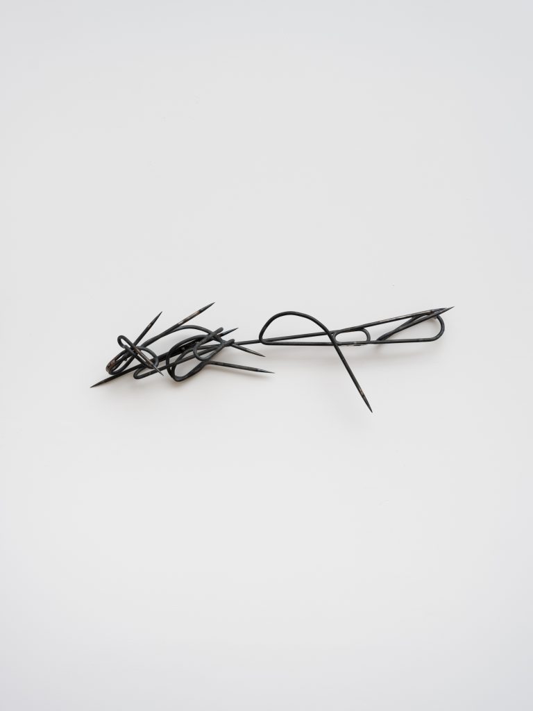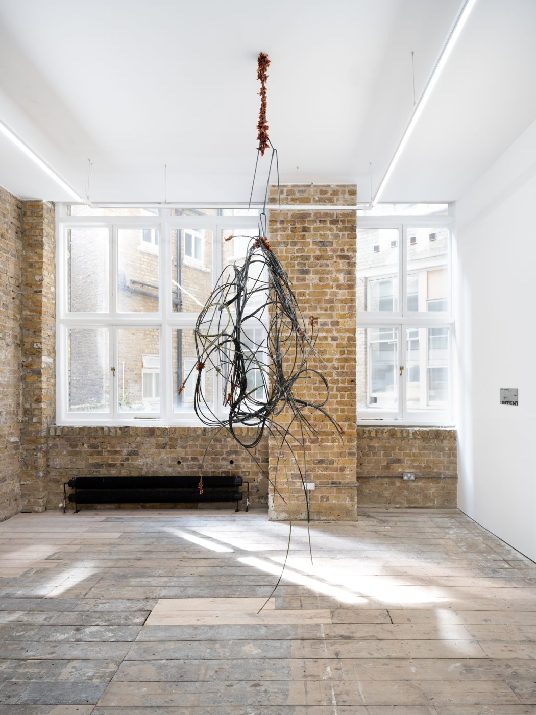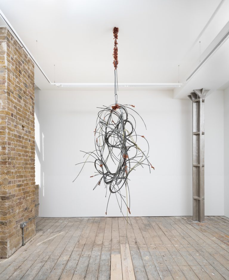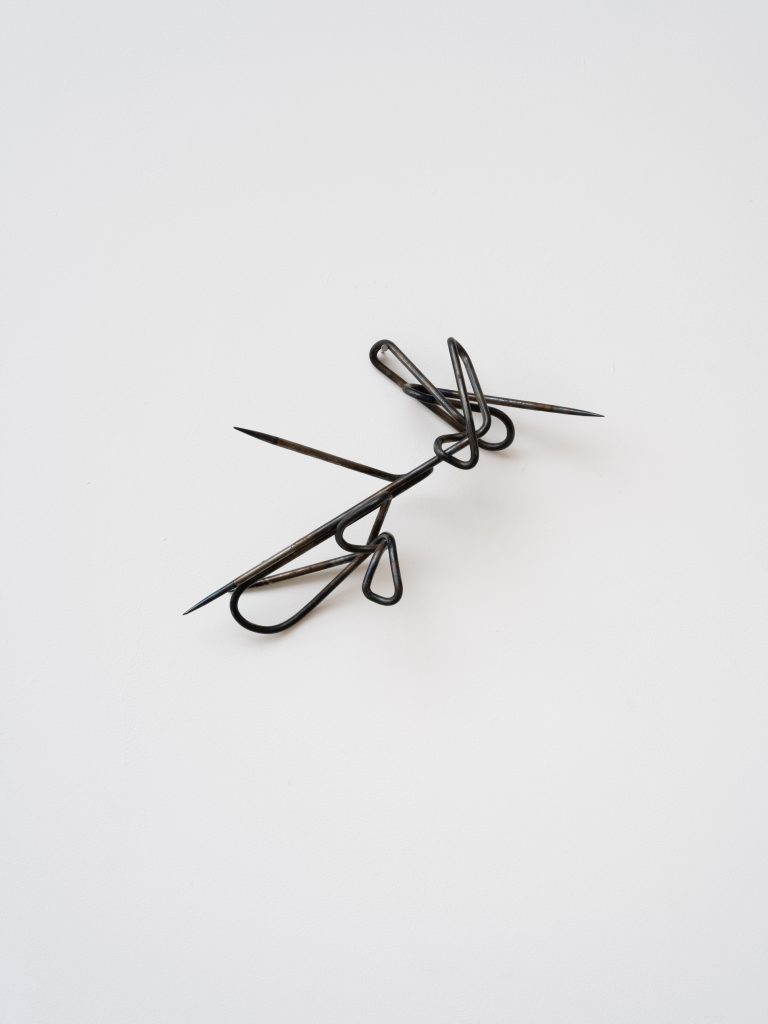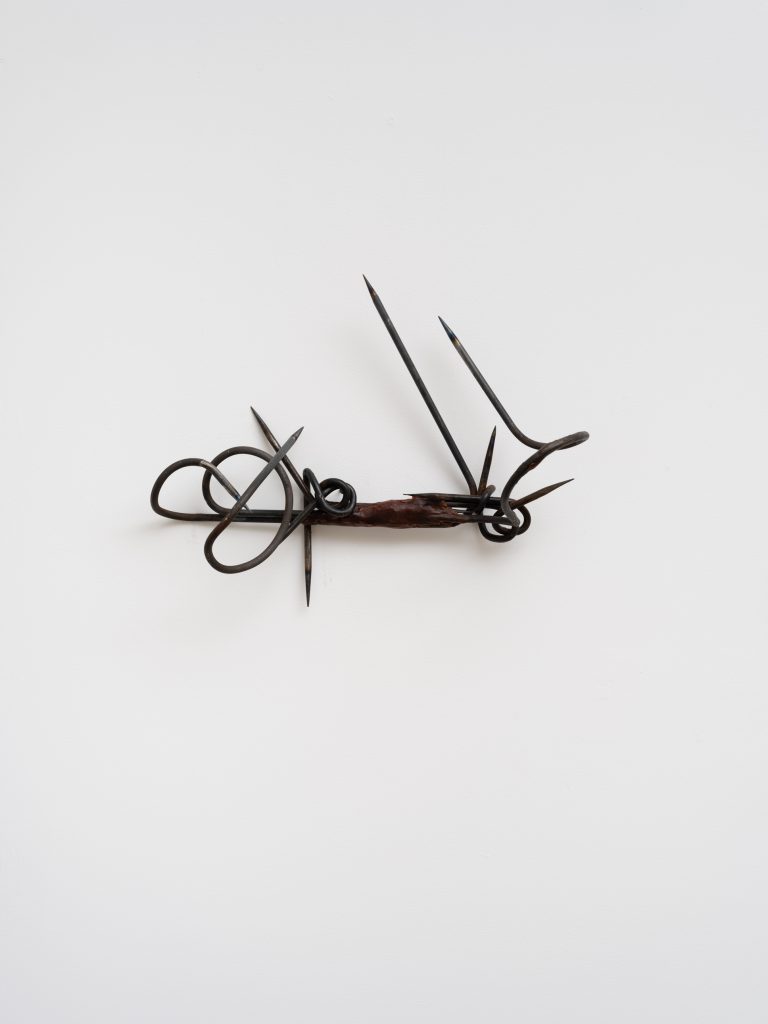 In Intent, these dualities are expressed through a series of sculptures composed of sanded and twisted spikes that form intricate knots. While their sharp edges convey feelings of threat and hostility, their rusted surfaces and serpentine curves imbue the works with a sense of fragility and vulnerability. Giving the impression of illegible words or convoluted signatures, these works are less seeking to resolve conflicting sensations than give a form to the very idea of paradox, exposing the contradictions that structure existence through contorted yet fluid shapes.