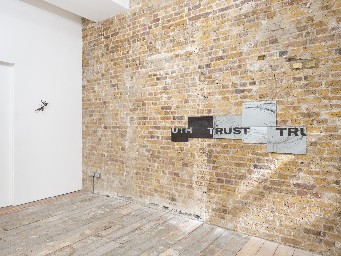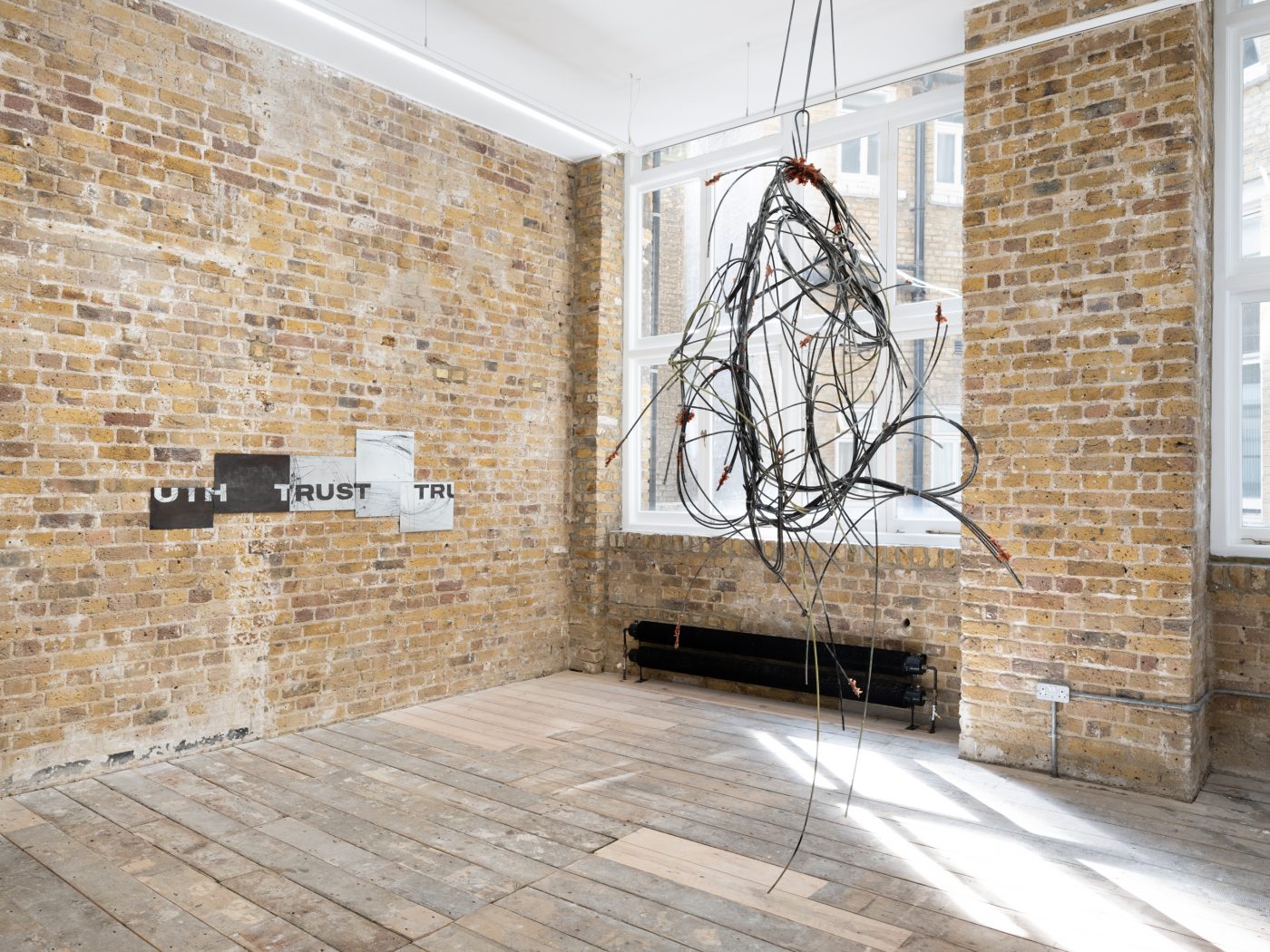 Perceiving the world as a site of continuous oscillation between opposing forces, Potier’s work can be seen as an attempt to rewire and reconnect dispersed materials, sensations, and ideas. In a series of zinc plates engraved with words and abstract lines, the artist plays on the alliteration between Truth and Trust, generating a semantic slippage that encapsulates these terms’ loss of meaning in so-called ‘post-truth’ societies. Rendered in bold fonts, these words appear as headlines or slogans, while Potier’s intense gestures—scratching, crossing out, over-marking—materialise tensions between language and physicality, logic and emotion.