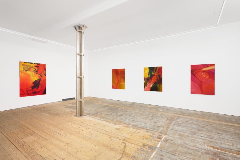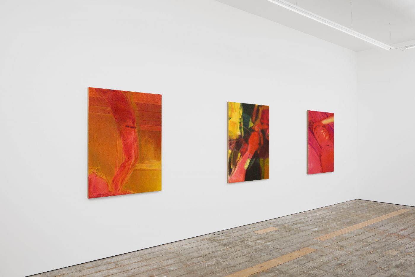 At NiCOLETTi, the exhibition unfolds across four paintings in an episodic hang in the main gallery space: close-ups of a sequence of fleeting moments that surface, then vanish. Think of the tension between two feet that almost touch each other, the muscular contraction of an arm, or the angelic glow on a face. Wolke’s croppings hint at activity outside of the painting; yet she doesn’t deny the specificity, individuality or texture of her muses, only our access to them.