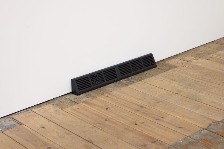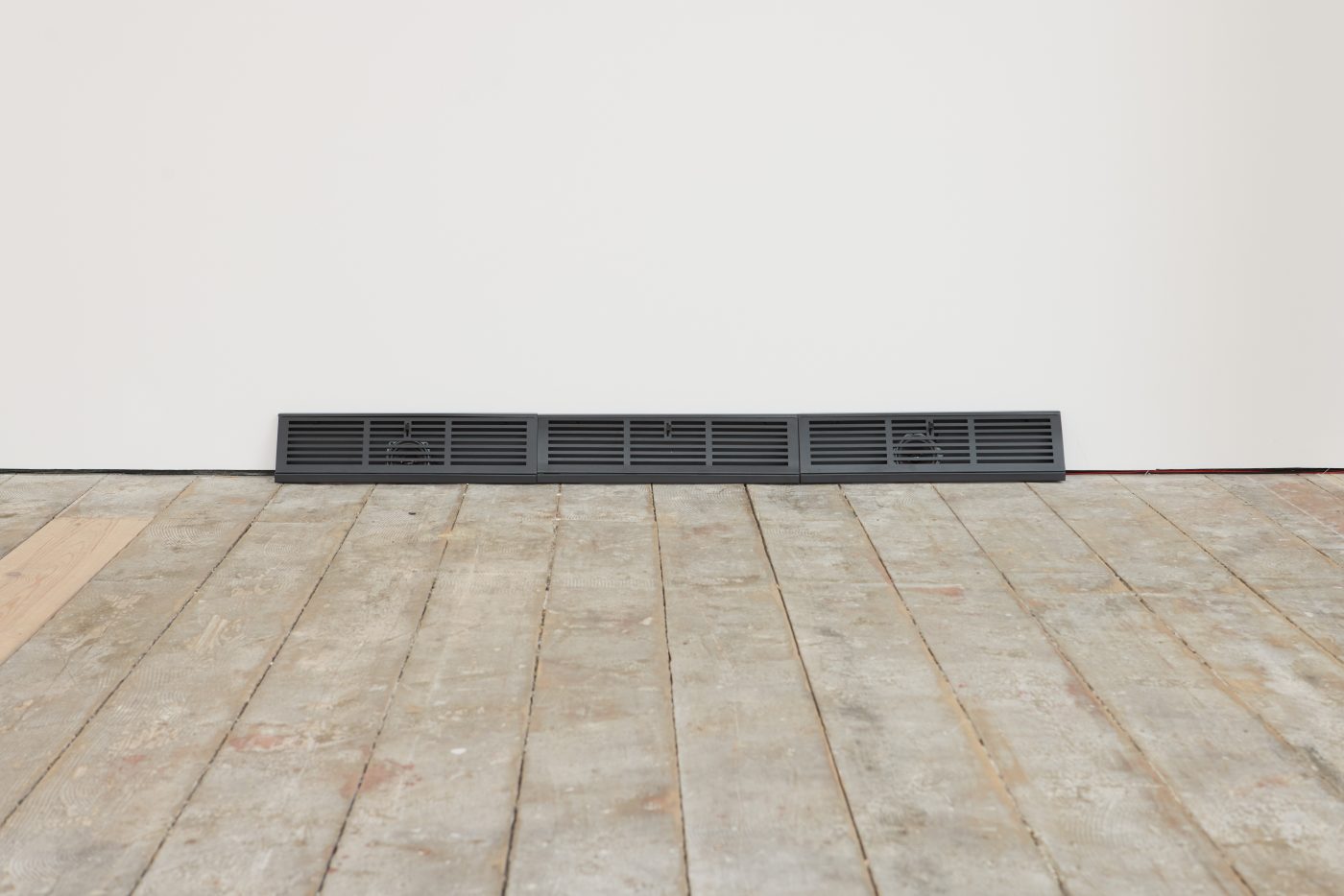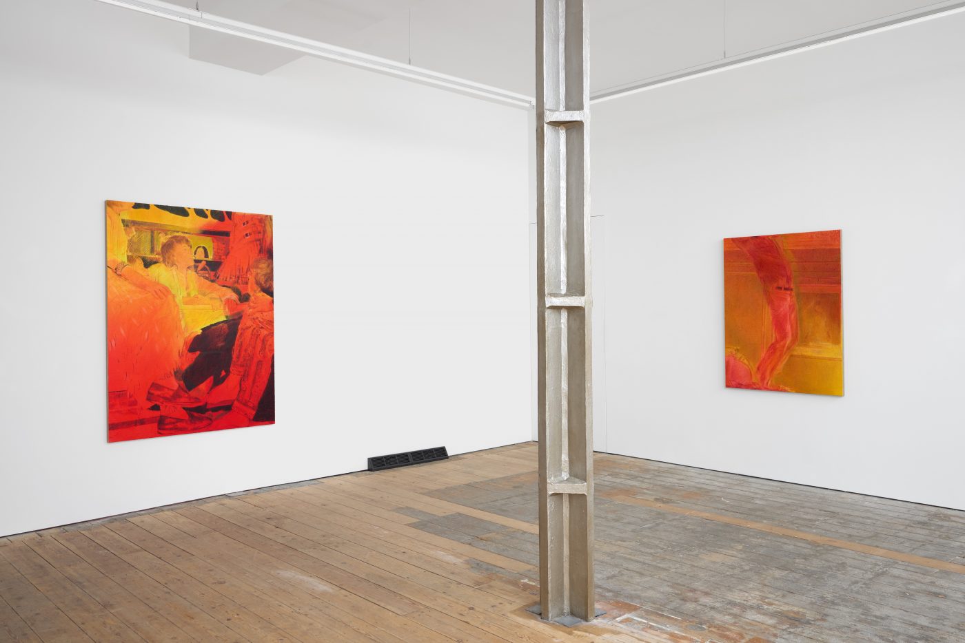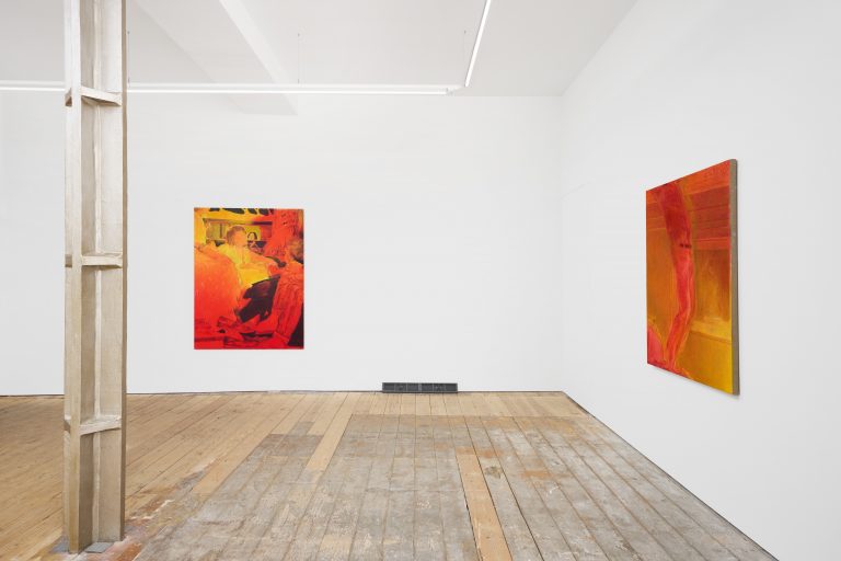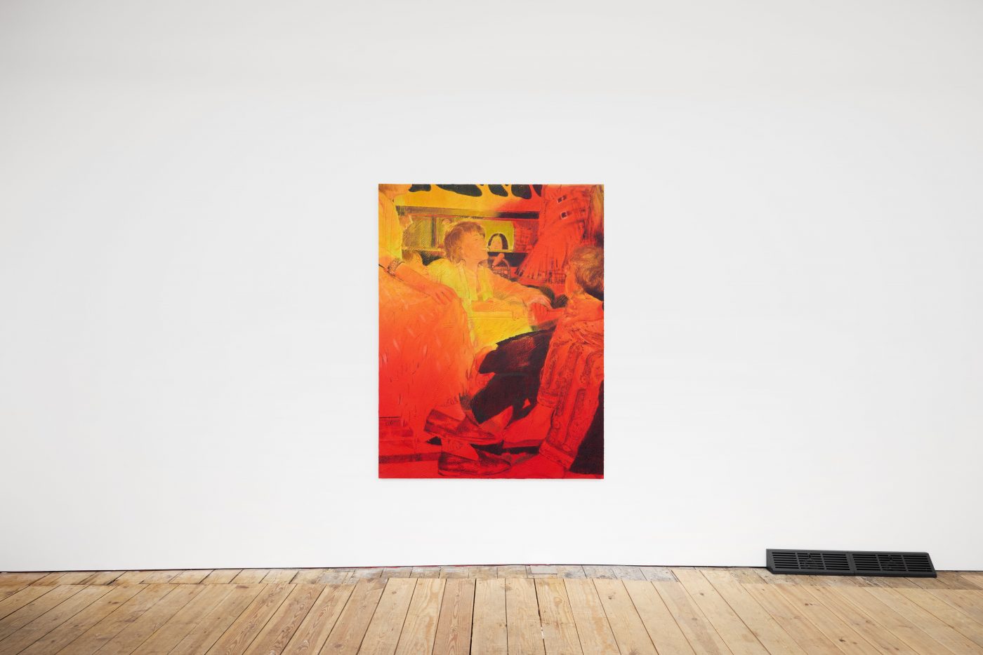 From two air vents, upbeat rock’n’roll songs by Sander Priston (translated into a sound installation by Gašper Torkar) fill the gallery. Priston is a close collaborator and muse of Wolke; this is the first time their practices intertwine. At NiCOLETTi, his soothing saxophone score communes with the sensual oranges, yellows and pinks in Wolke’s paintings. From a distance, we can make out the distinct soundscape of a hotel: like the creaky sounds of opening and closing doors, or the distant chatter coming from the hallway, and other ambient sounds. Background music that lets our minds wander.