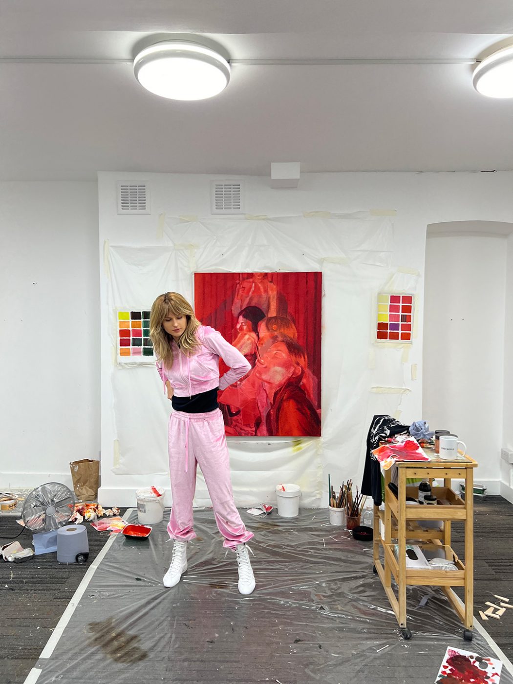 Imagine an evening of hedonism and debauchery at The Savoy: champagne flows, pillows fly, baths are drawn. A trail of shoes and clothes strewn across the floor. In Nothing Left to Want, Nana Wolke shares glimpses of such an evening in a suite of new paintings. Drawing on Oscar Wilde and Lord Alfred Douglas’s stay at The Savoy between 1893 and 1895 – which sowed the seeds for the Irish poet’s downfall and early demise – the Ljubljana-born and New York-based artist and a group of muses – London-based artists, musicians, friends, socialites – descended on the formerly adjoining rooms 362 and 361 of London’s iconic hotel on the Strand. The prompt? ‘Come in an outfit you’d be happy to be caught dead in’ – as per the artist’s instruction.
