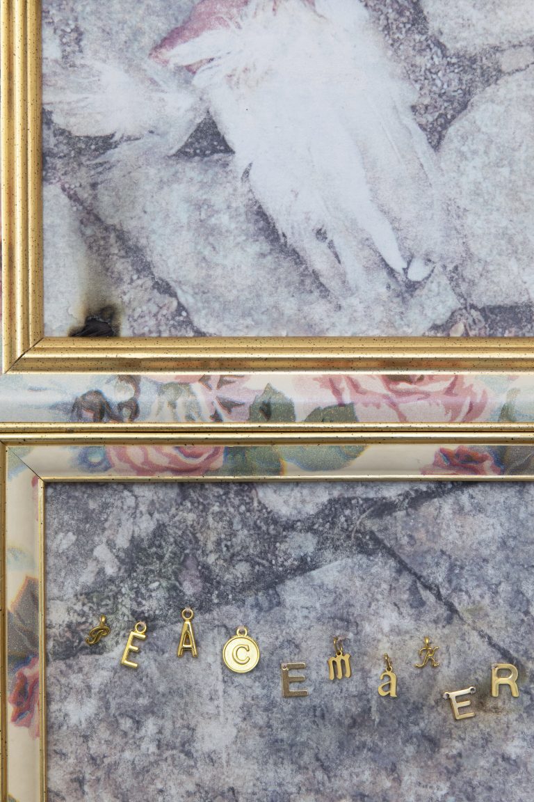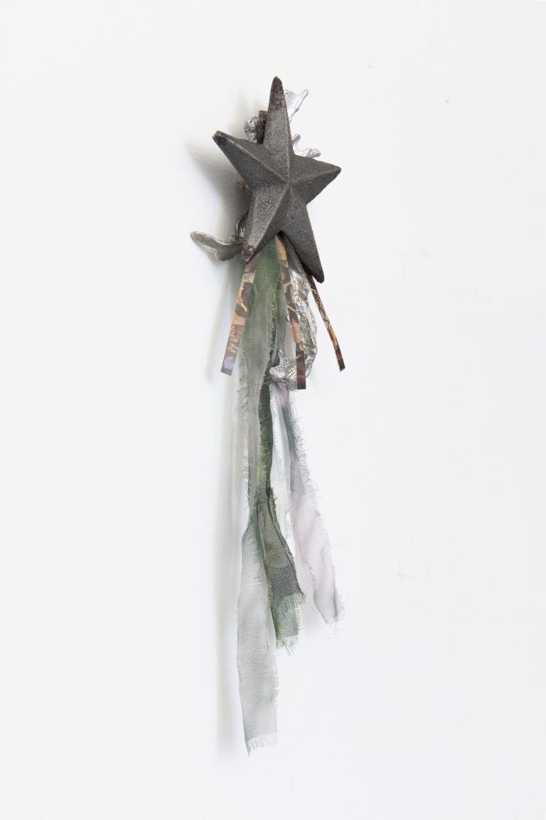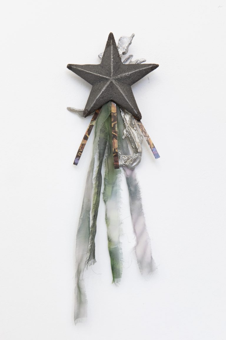 The accompanying wall-based sculpture, A Promise to Forever (2026), acts as a material residue of the unreached destination. Cast in iron and aluminium, the work carries a deconstructed ticket to the Makedonium, providing physical weight to the film’s elusive narrative. Here, the recurring motif of the star serves as a silent coordinate, tracing a shared post-socialist lineage between the regions represented on the boat. This geopolitical gravity is indicated by a collision of registers: the monumental and the Lolita-fashion-coded bow; the iron-hard history of the state and the soft, devotional aesthetics of the self.