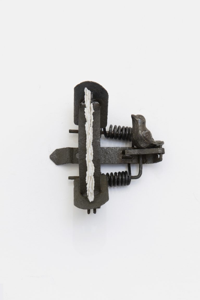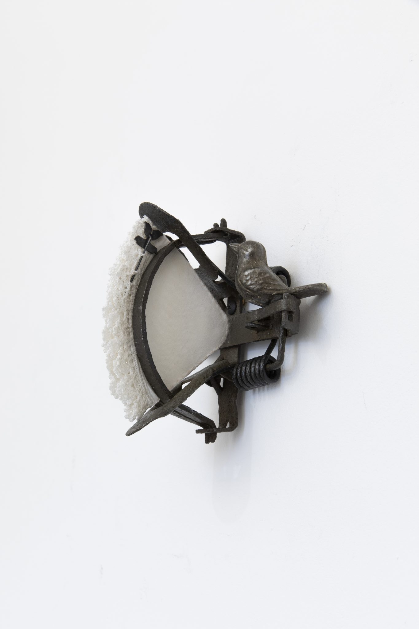 This dialogue with mortality continues in the sculpture Flesh Before Memory (2026). A rabbit trap rests in the gallery like an interrupted sentence – the architecture of a potential ending. If the images of deceased pigeons register disappearing, the trap theorises its manufacture. By adding a lace handkerchief and a Spomenik pin badge into the mechanism’s cast-iron frame, Huang forms a diptych on fragility as a condition shaped by systems, both domestic and ideological. In this, she offers a grim proposition: we mythologise the birds that vanish and aestheticise those we find, yet we continue to manufacture the mechanisms of their disappearance.