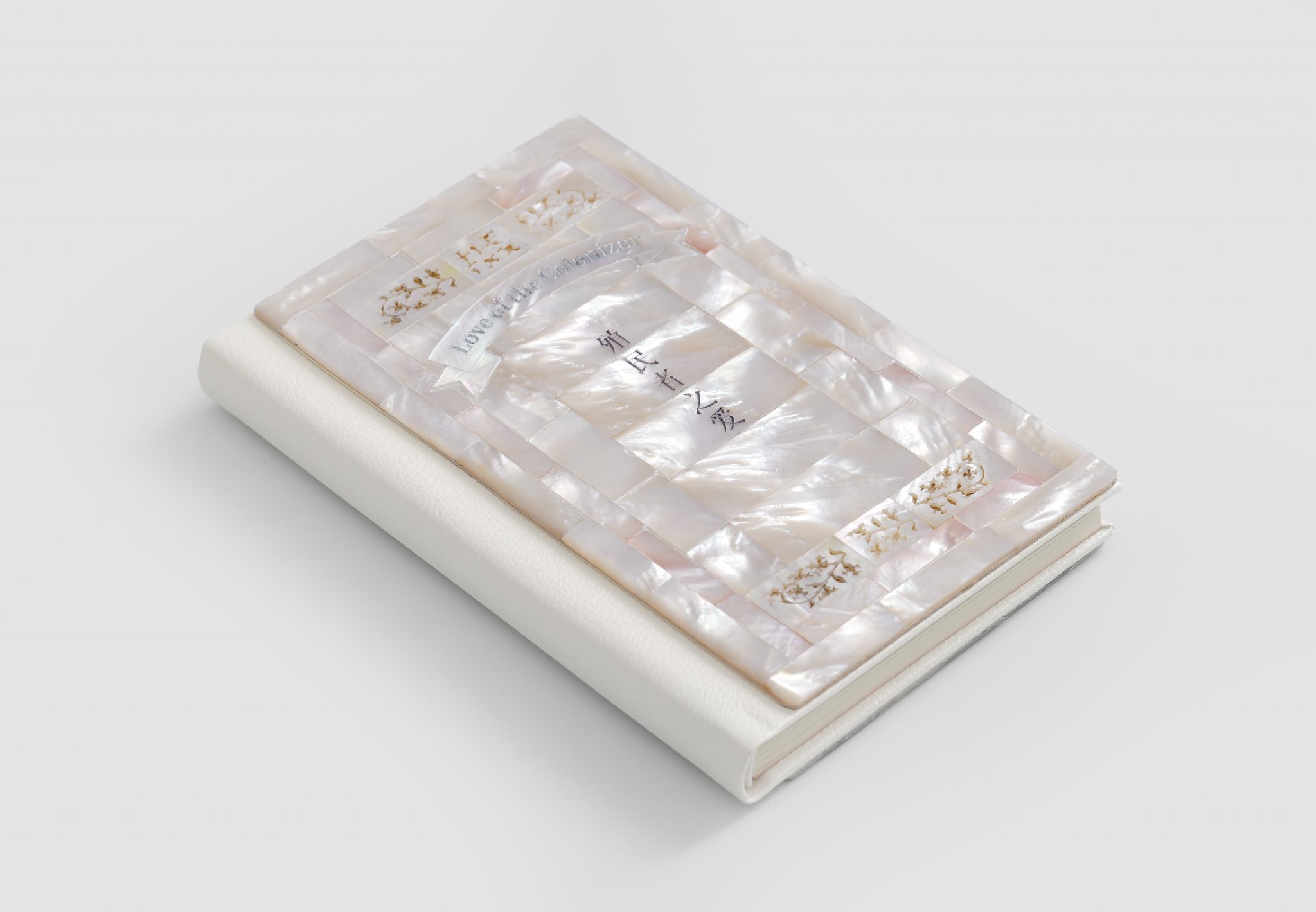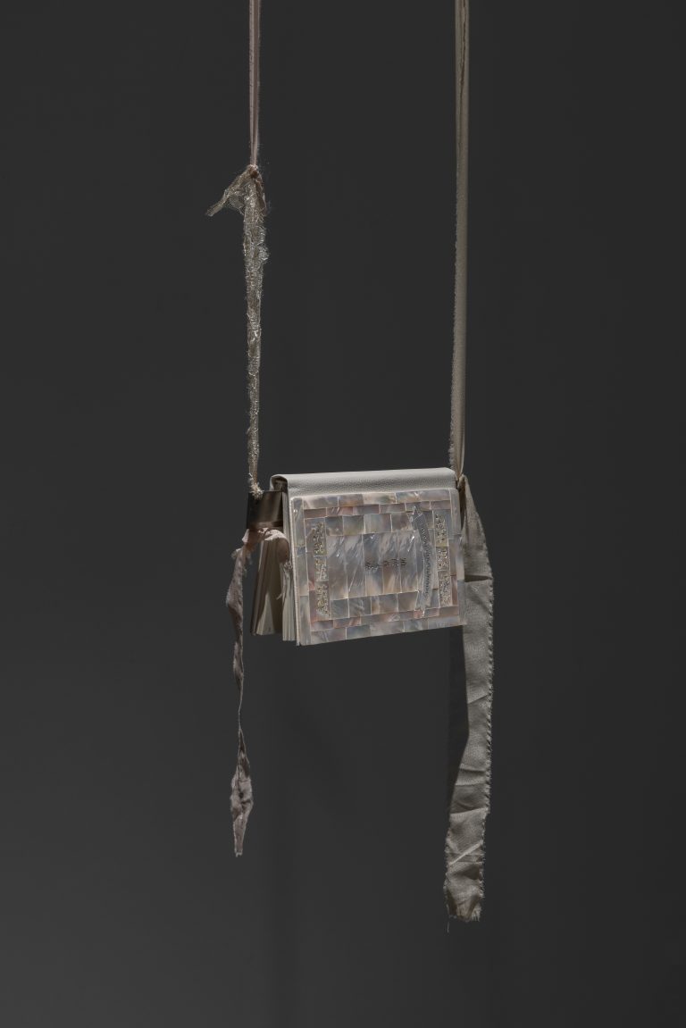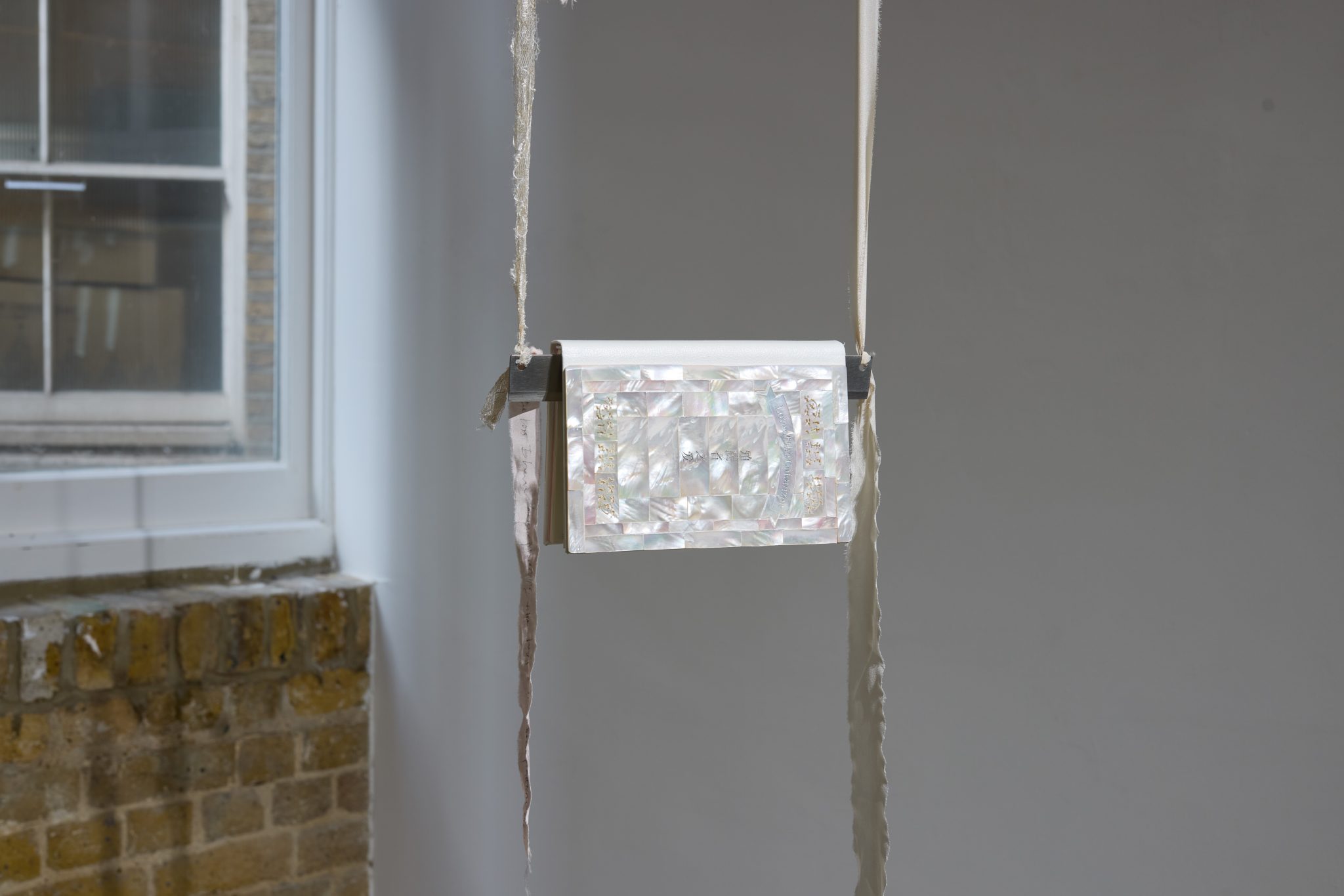 The installation Love of the Colonizer (2025) centres on Huang’s eponymous book, a collection of prose and poetry written during the pandemic. Voiced through ‘Siming’ – a speculative alter ego and transliteration of the artist’s name – the book embodies a devotion perpetually shadowed by friction and the weight of othering. The text functions as an emotional chronicle of survival, a monologue where language touches, omits, and suggests. This balance is physically enacted in its presentation: its cover, encrusted with pale pink nacre, catches an iridescent sheen – a material that is itself a defensive secretion. The book is impaled upon a blade, held by the binding that clings to the cold silhouette of the steel. Suspended from ropes that function simultaneously as a lyrical swing and an emergency escape line, the object exists in literal suspension – a manifestation of a devotion that must negotiate its own survival within a dominating gaze.