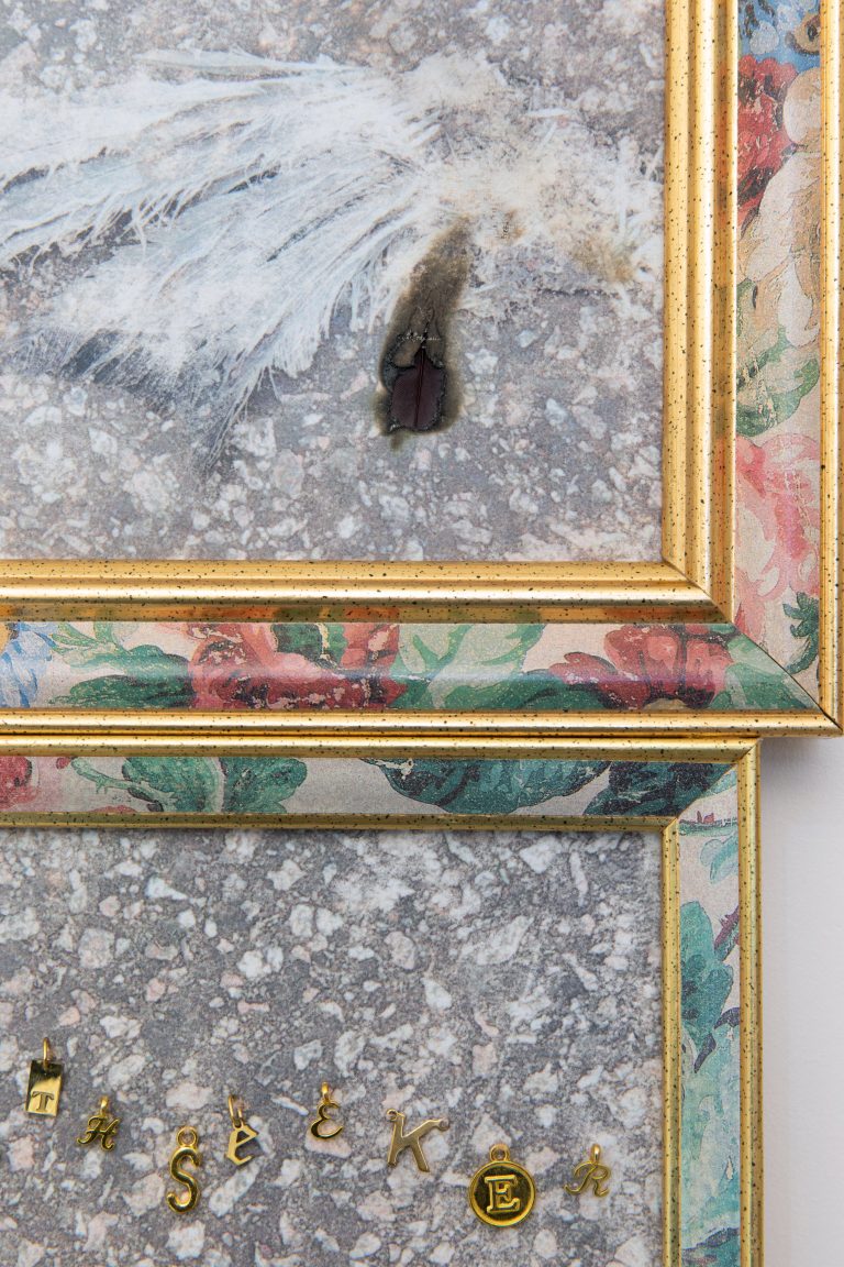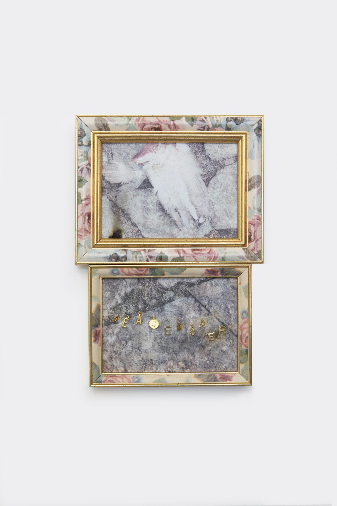 In two image-based textile pieces – Which version of my body? (truthseeker) (2026) and Surrogate (peacemaker) (2026) –, Huang archives bodies of birds found on city streets, stilled in the aftermath of flight. Framed in cloth and embroidered with beaded text, these works reach back to a time when the seasonal disappearance of birds was explained through myths of transmutation. By re-clothing the sudden absence of a pigeon in textile and the symbolic weight of embroidered titles, she negotiates the transition from the biological to the monumental. The physical density of the body is traded for the weightlessness of myth, transforming a common street occurrence into an act of collective grieving.