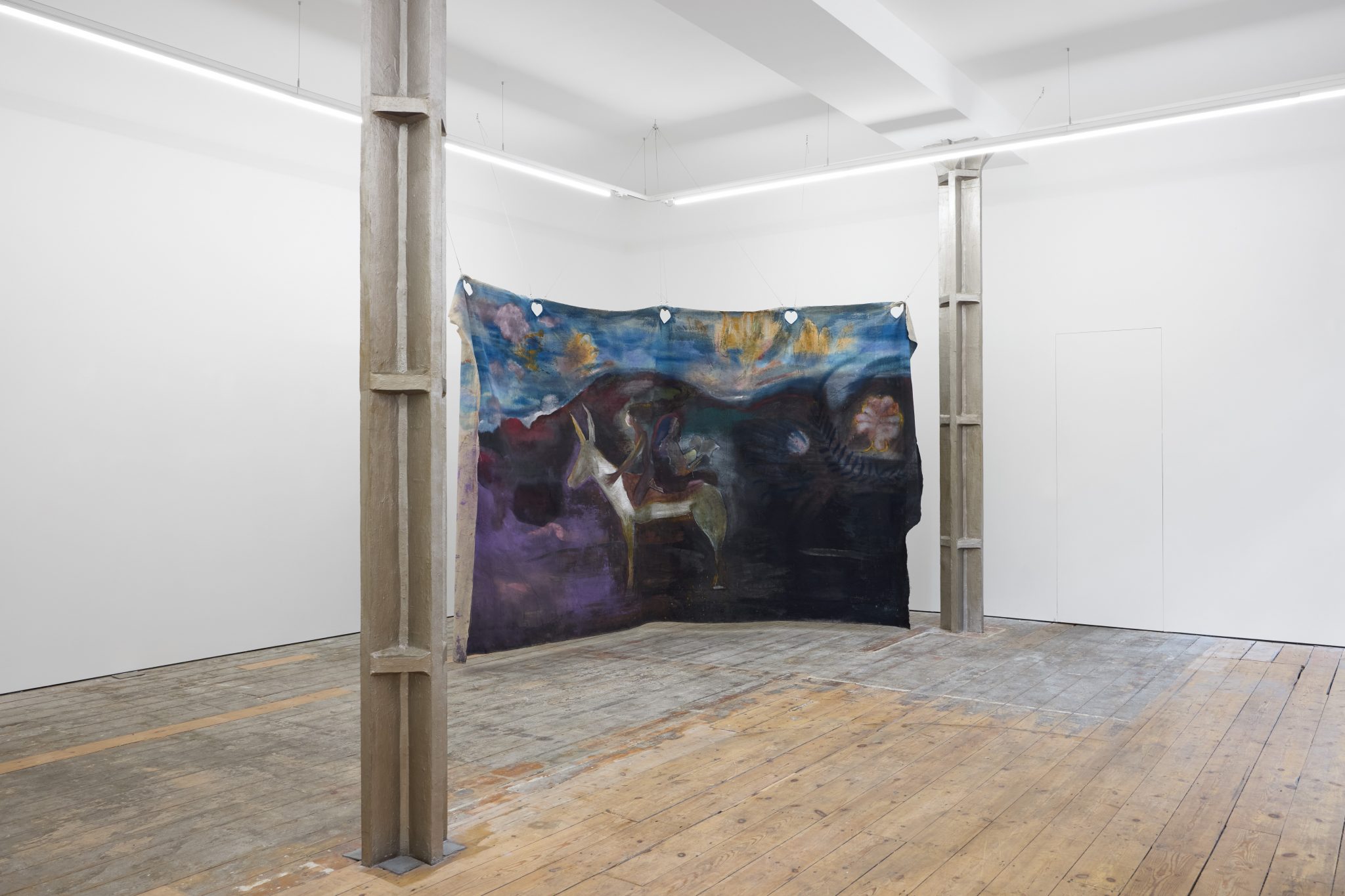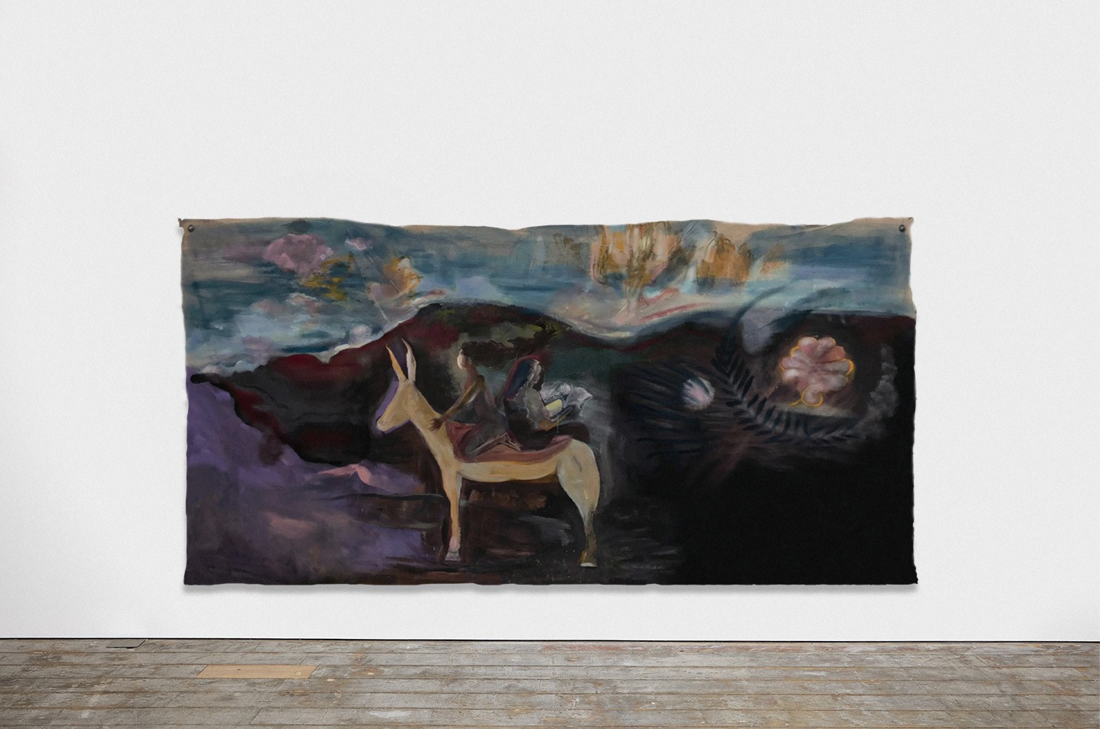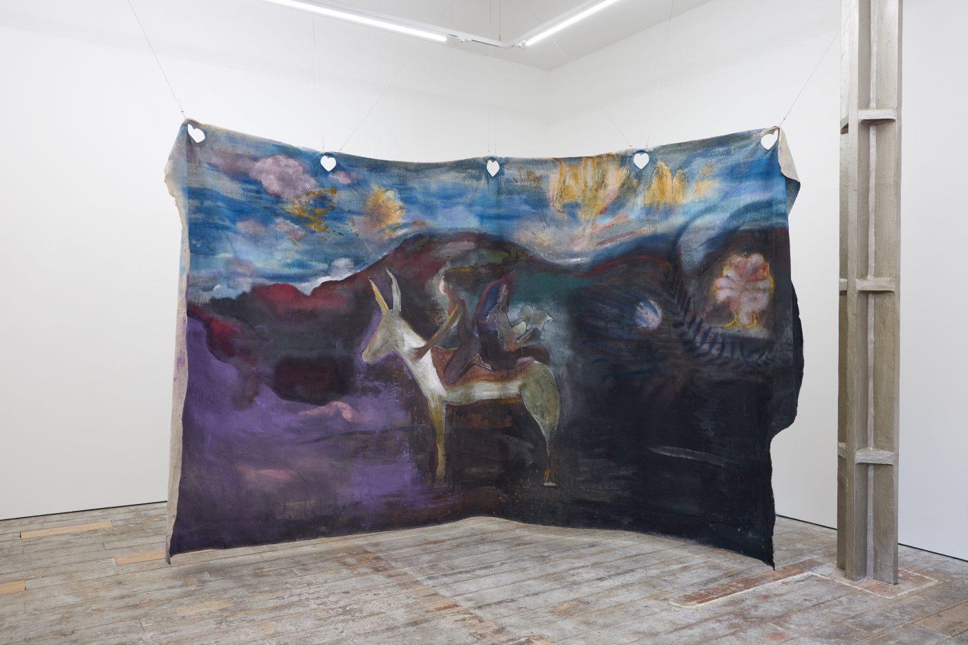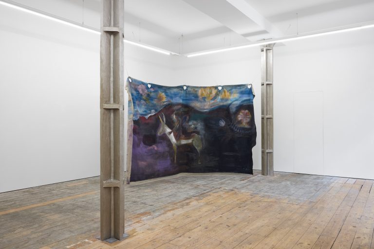 In the main room, Di Folco Jemni’s exhibition centres on a large-scale, unstretched canvas suspended from the ceiling. Titled The Smell of Freshness, the work is a poetic homage to Rabia al-Adawiyya (also known as Rabia Basri, 713/717–801), an Iraqi poet and one of the first Sufi mystics. Characteristic of Di Folco Jemni’s practice, which explores themes of feminine spirituality through mystical figures and ancestral rites, the painting features two representations of Rabia, back to back on the same horse. This doubled figure evokes both Rabia’s reputation as a fierce, independent woman exploring the mystical potential of her natural surroundings and her legacy as one of the most significant intellectual figures of early Islam.