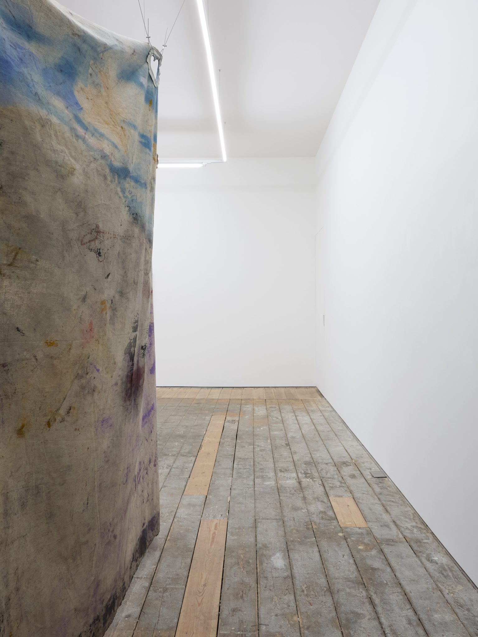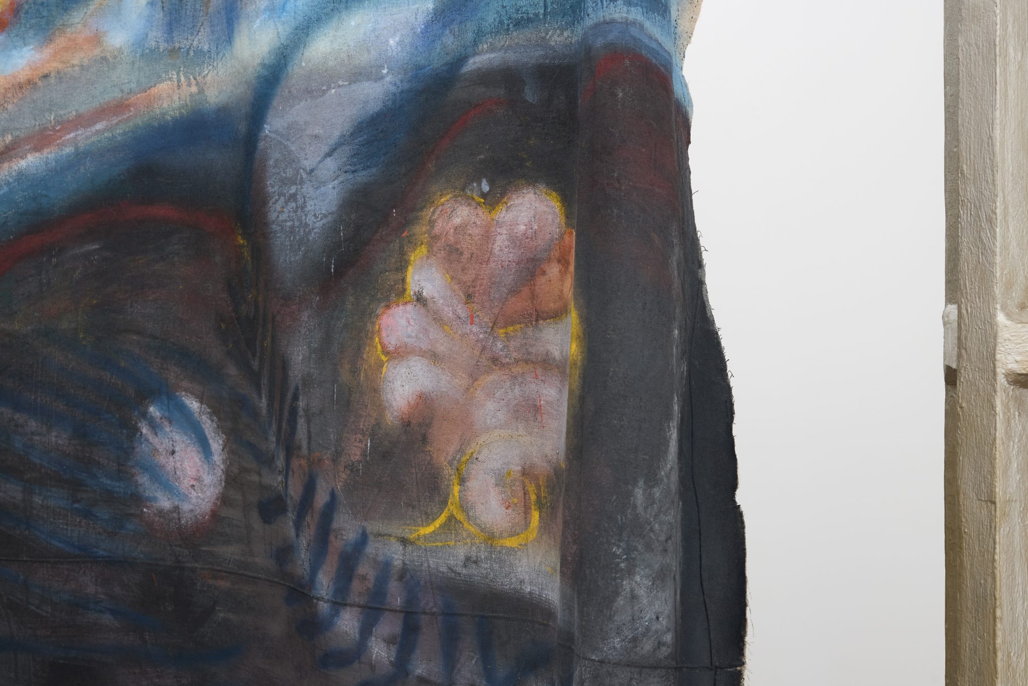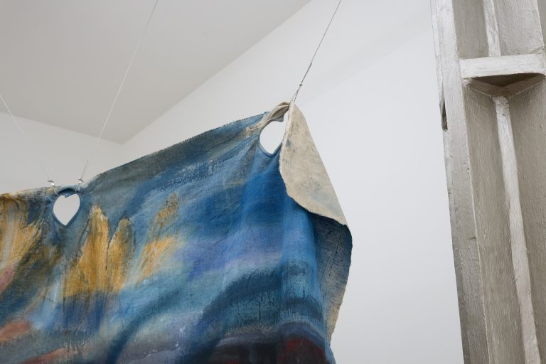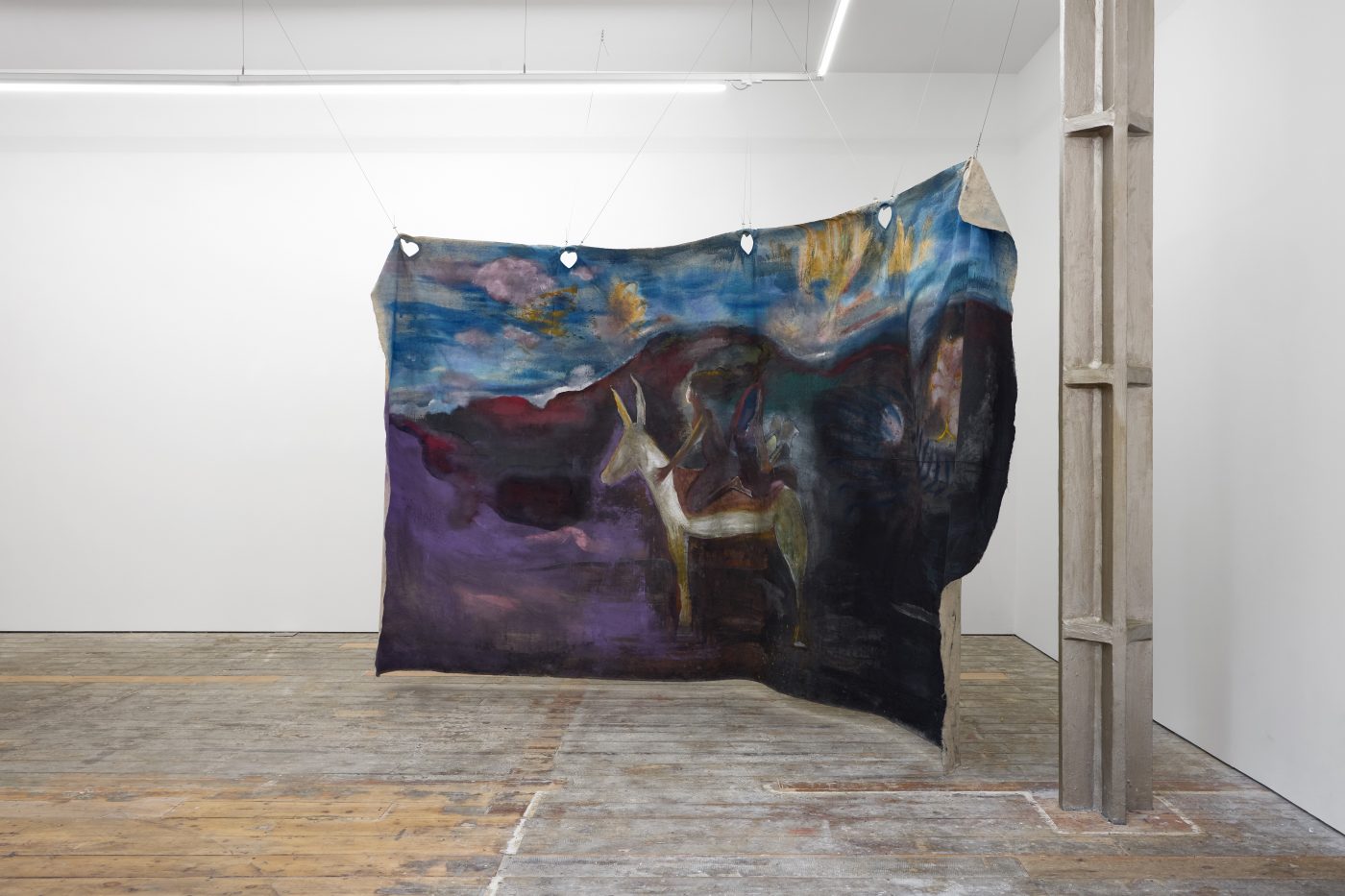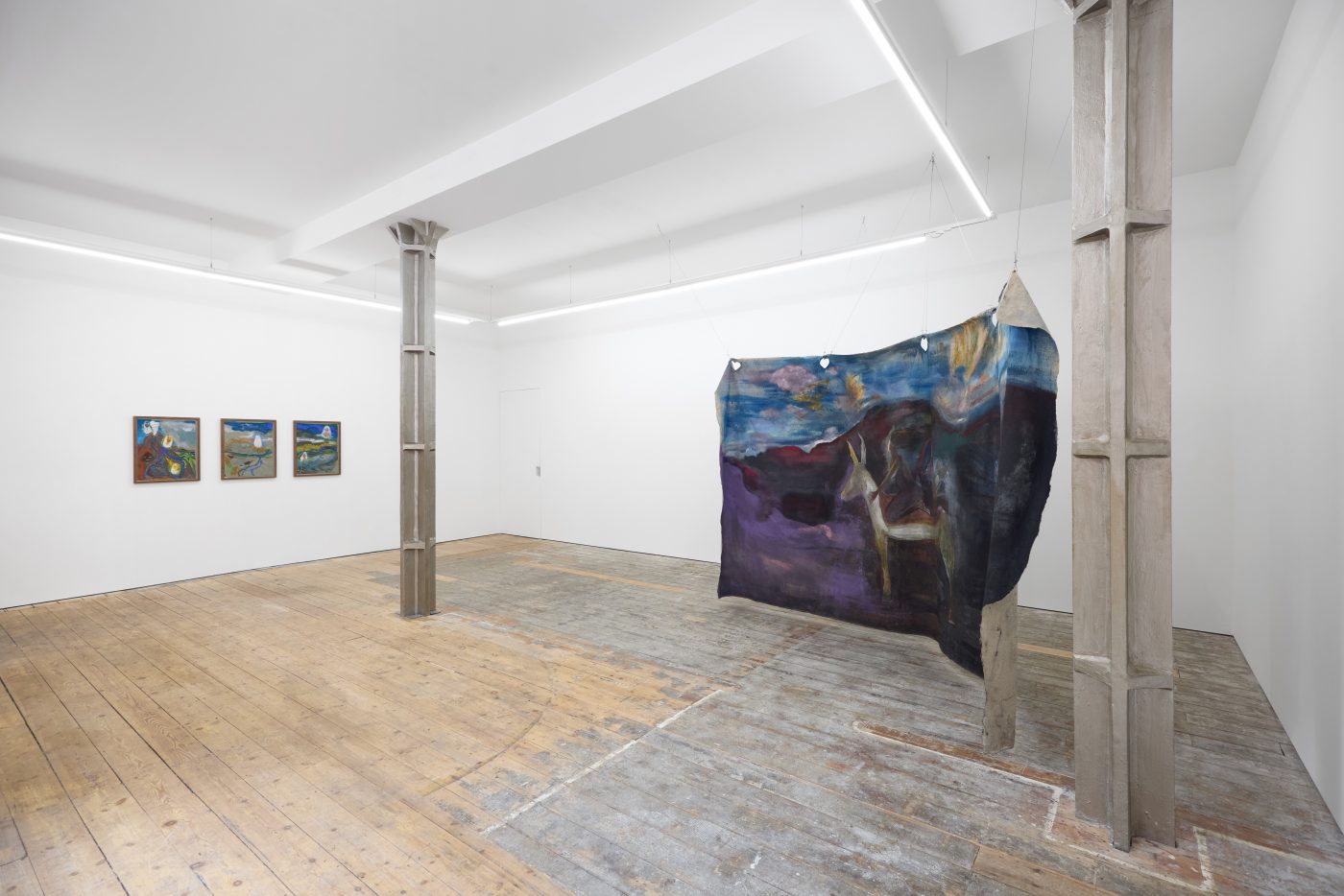 In the main room, Di Folco Jemni’s exhibition centres on a large-scale, unstretched canvas suspended from the ceiling. Titled The Smell of Freshness, the work is a poetic homage to Rabia al-Adawiyya (also known as Rabia Basri, 713/717–801), an Iraqi poet and one of the first Sufi mystics. Characteristic of Di Folco Jemni’s practice, which explores themes of feminine spirituality through mystical figures and ancestral rites, the painting features two representations of Rabia, back to back on the same horse. This doubled figure evokes both Rabia’s reputation as a fierce, independent woman exploring the mystical potential of her natural surroundings and her legacy as one of the most significant intellectual figures of early Islam.