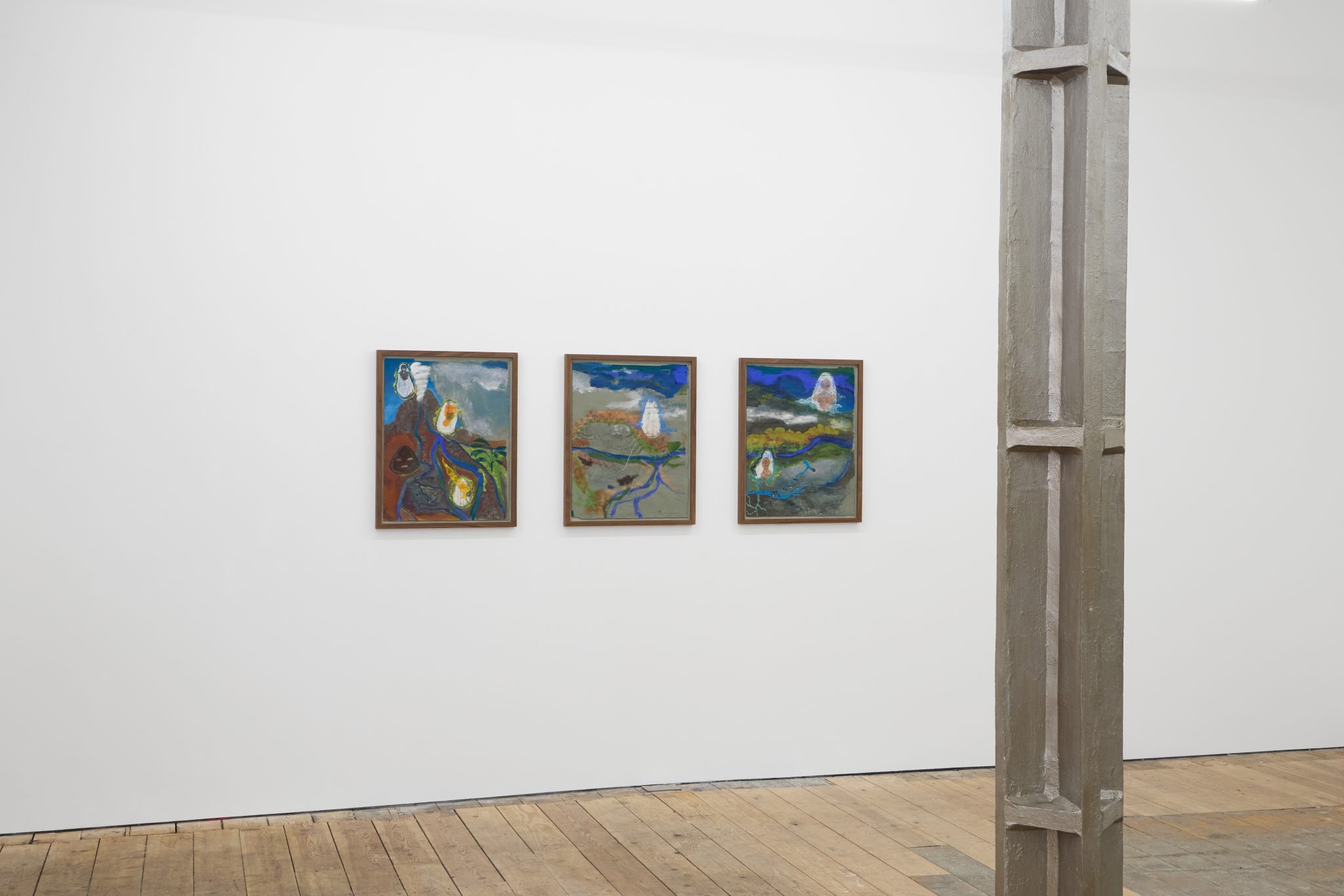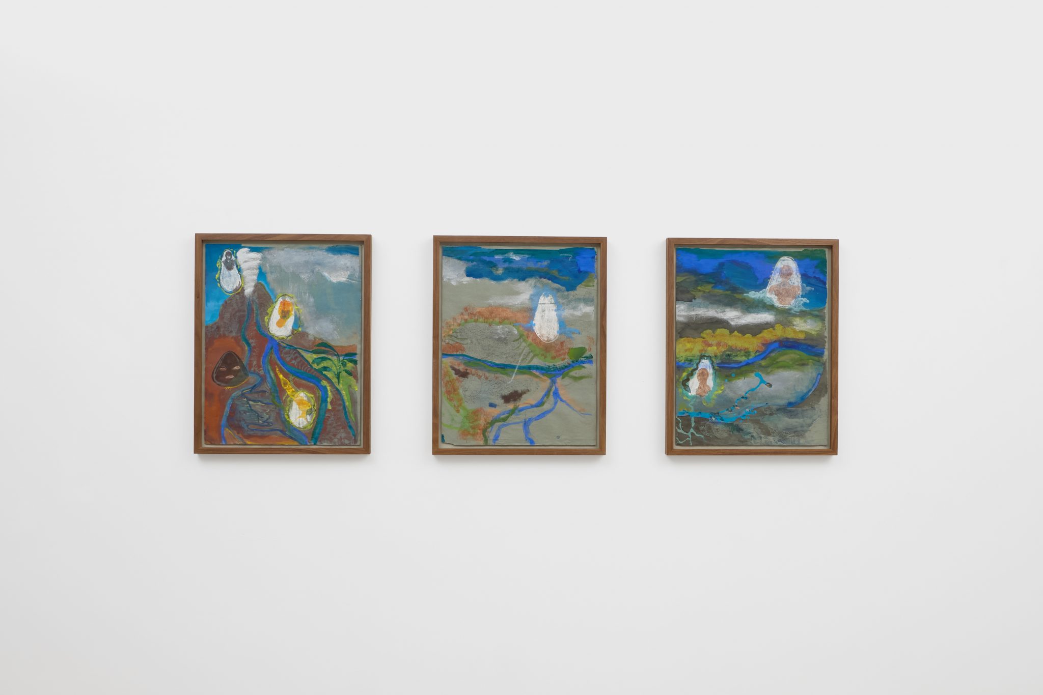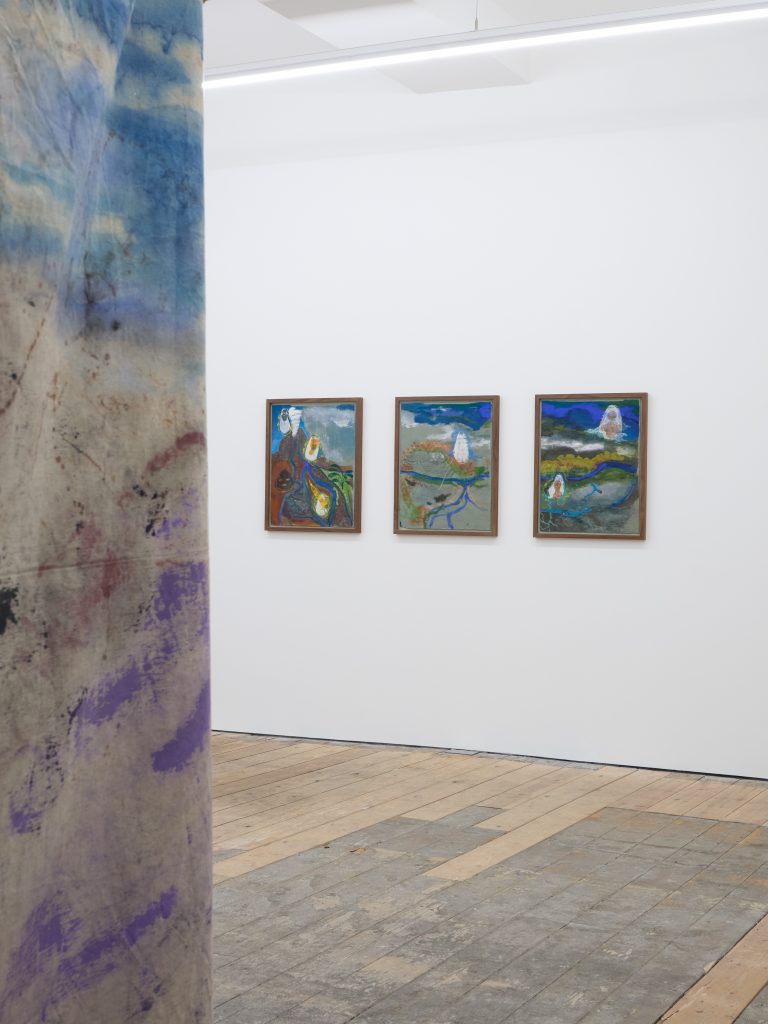 These ideas are furthered explored in Riparia, a triptych of works on paper named after the Latin term for riverbanks. Inspired by Afro-Cuban cosmogonies studied by the artist during a trip to La Havana, where she attended the Instituto Superior de Arte, the work is populated by Orishas – divine spirits or deities representing natural forces and human attributes. Following the course of a river from its source in the mountain to its flow into the ocean, Riparia features representations of Oya (goddess of storms); Elegua (protector of paths); Oshun (water spirit and patron saint of Cuba); as well as Yemaya (Orisha of the ocean), among others.