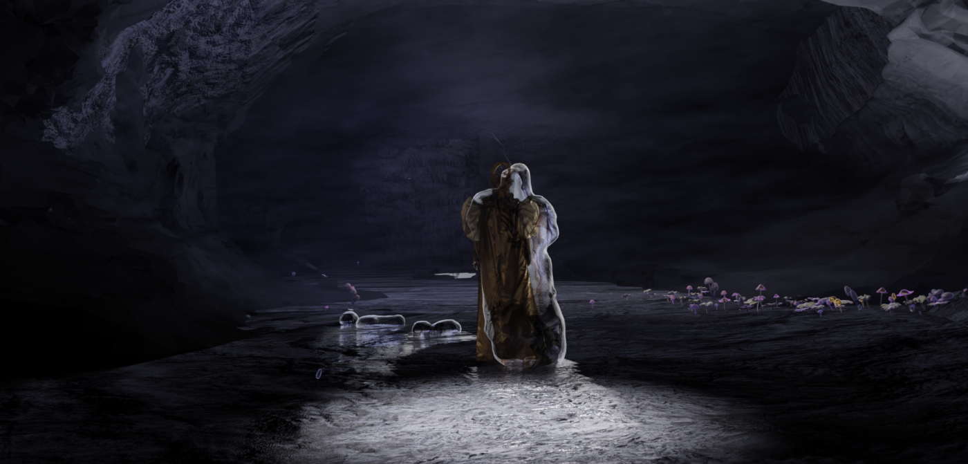 In Dislocations, Persona meets several characters who fought against colonization, such as Marthe Ekemeyang Moumié, Ruben Um Nyobé, and Ernest Ouandié. In so doing, Persona tries to connect the dots to recompose and pay homage to portions of History that often remain hidden. Here, memories take the shape of water, emerging from the cave in half-human, half-liquid forms that are sticking to Persona’s body, which is itself slowly turning into an ocean of memories.