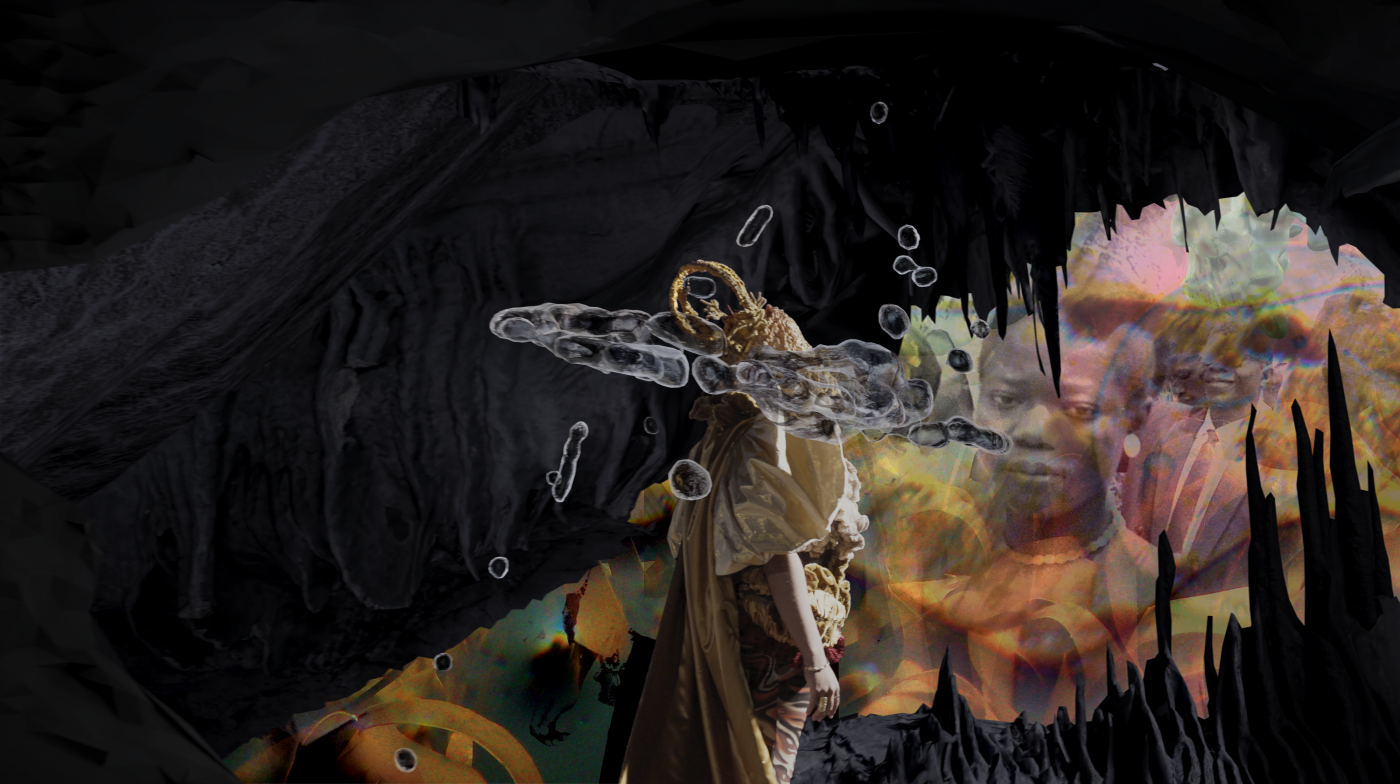 Unfolding in a cave floating in outer space, Dislocations follows the initiatory journey of Persona, a fictional character attempting to retrieve the memories that were lost during Cameroon’s struggles for independence. Throughout the film, Ntjam takes the image of the cave as an allegory for the spaces of revolts and dissension that developed outside the enlightenment project.