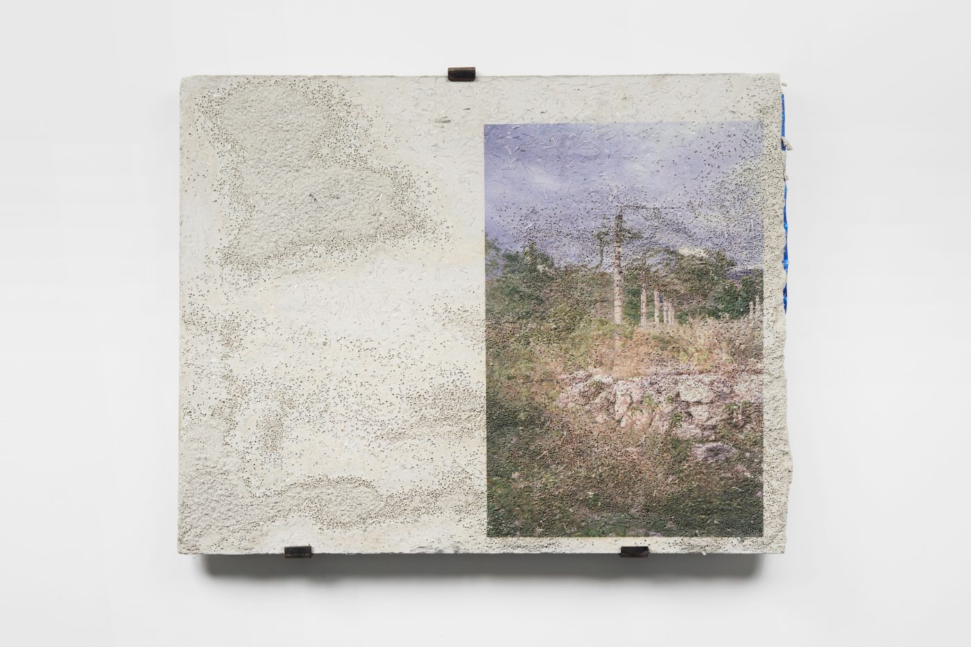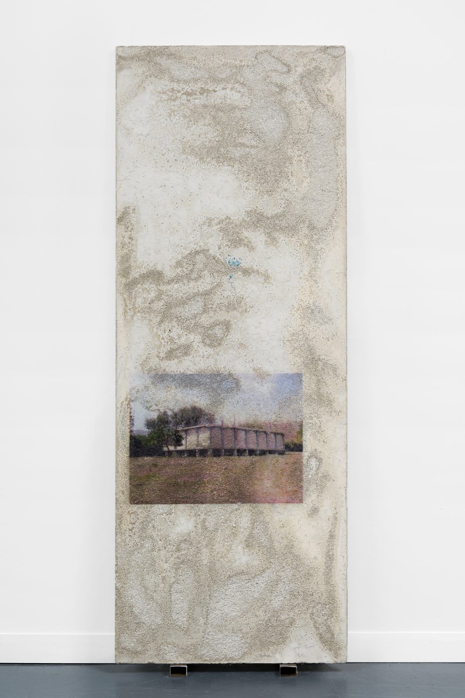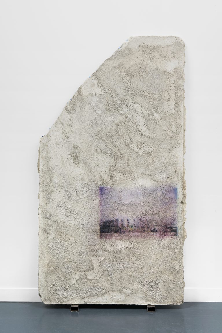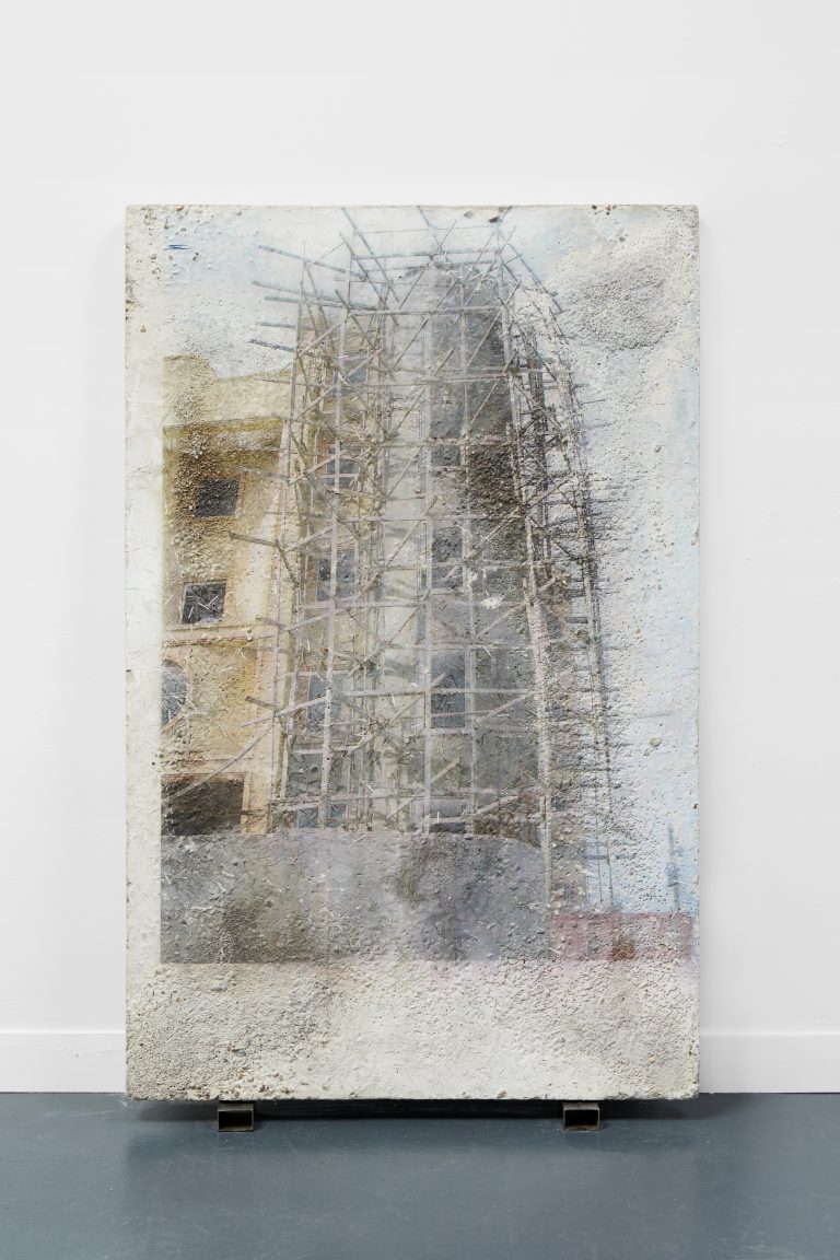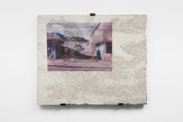 Developed after the earthquake that ravaged the country in 2010, this group of works documents the houses and buildings that have been destroyed by the natural disaster, as well as Port-au-Prince’s everyday life, which Choisne continues to shoot today. By printing photographs on concrete, Choisne attempts to give a material existence to her images, evoking the persistence of memories inscribed on architectural fragments. Choisne then rubs her Stèles with coarse salt to erode their surfaces. Referring to Haitian folk traditions, in which coarse salt has the symbolic function of protecting people against malicious spirits, this process generates marbling landscapes at the surface of the Stèles, creating an antinomic relationship between the forces of raw matter and the precariousness of recollection.