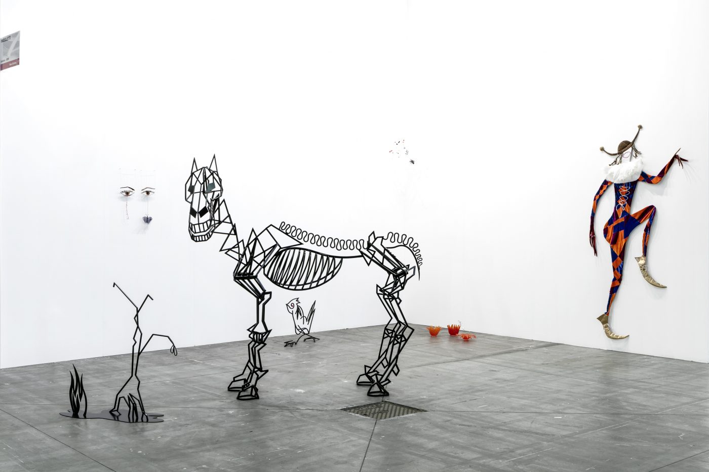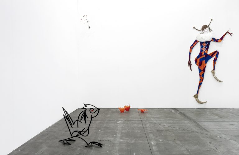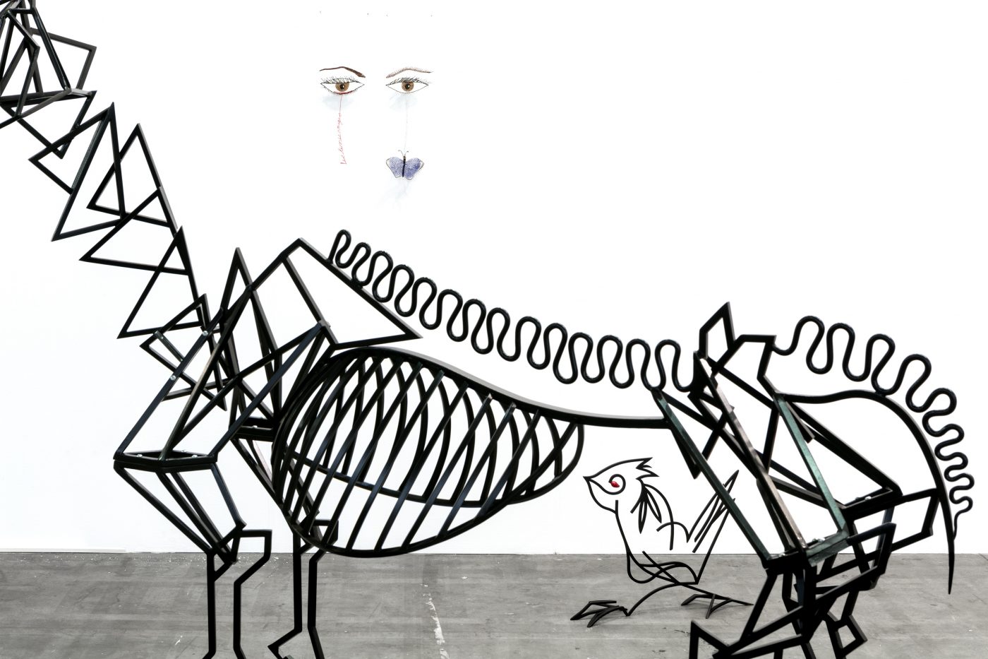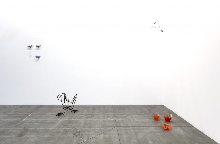 At Artissima, Béna’s exhibition will comprise a series of sculptures forged in black-coated metal, presented alongside glass objects and hand-made lace works. The centre stage will be occupied by a monumental horse, whose sleek materiality and angular carcass suggest a fusion between animal and machine. A nod to the story of the Turin Horse, which tells how philosopher Nietzsche suffered a mental breakdown after seeing a horse being whipped in the street of Turin, Béna’s horse also evokes equestrian statues, which are traditionally used to celebrate triumphant male conquerors in Western city squares. Here, Béna deconstructs that tradition by surrounding her horse with composite organisms that play with the codes usually associated with the masculine and the feminine. These include hybrid birds, a pair of women’s legs displayed against the wall in an evocative position, a flower made of glass, which features miniature phalluses on its head, and a finely laced spider web – usually ascribed female for its dexterous crafting abilities –, which appears to have caught fetish objects such as a lipstick, a hairpin, and a pair of puckered lips, all references to the artist herself. Combining humor and seriousness, self-reference, irony and political consciousness, Béna’s display will invite viewers to navigate an enigmatic environment that breaks through dominant gender roles and binary oppositions to conjure the performative nature of cultural representations.