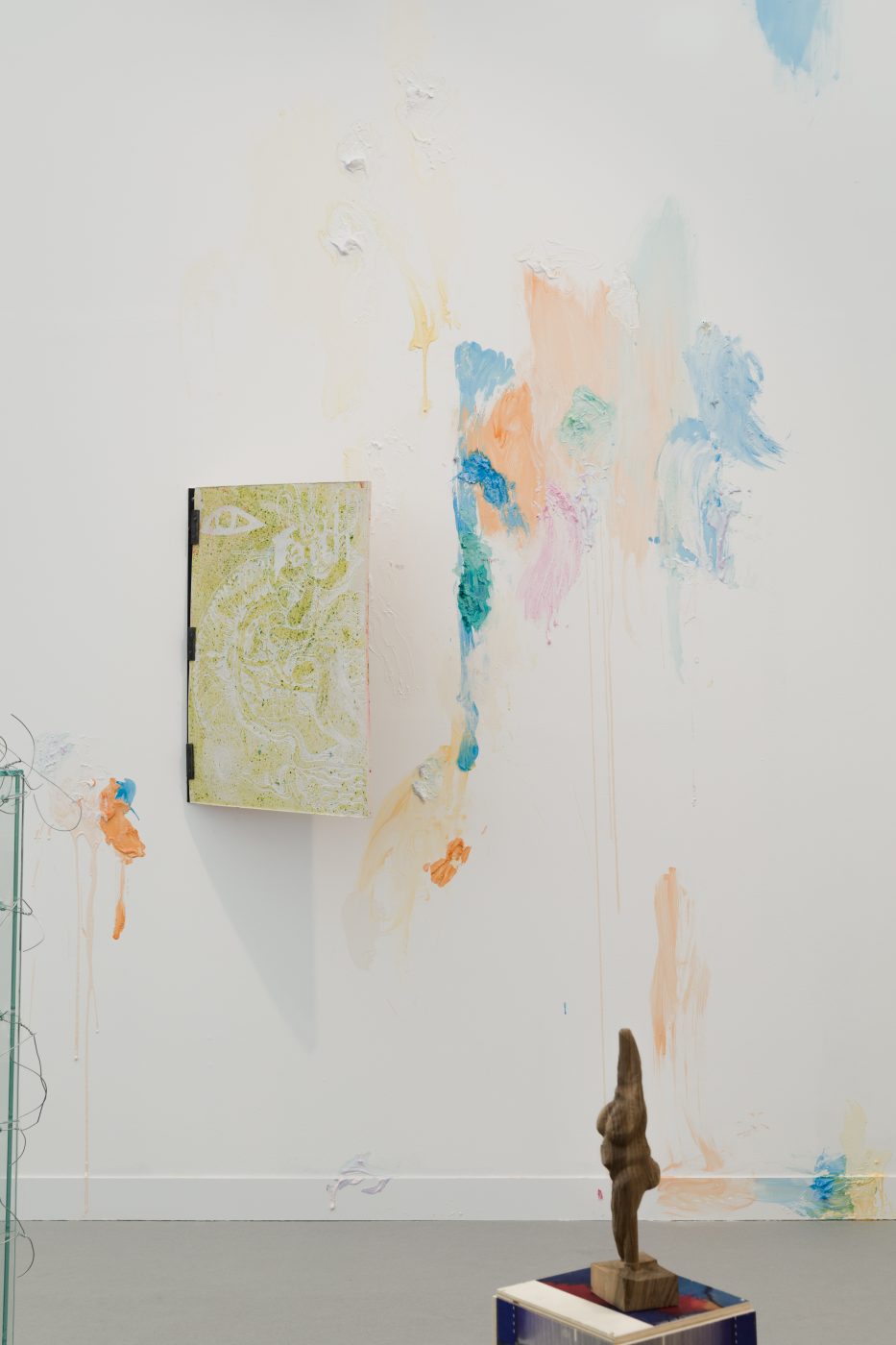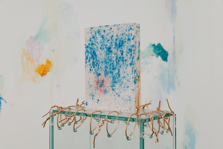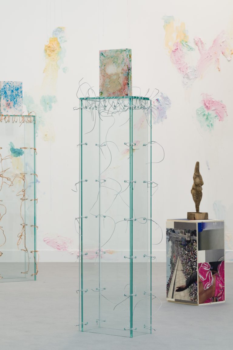 Twisting this concept to analyse how the residues of colonialism pervade the material world, Choisne’s sculptures are displayed on glass plinths, contrasting their abounding materiality with lightness and transparency. Two larger versions are mounted on metal binding and shown on the wall, evoking the altarpieces’ panels that alternatively reveal and conceal narratives.