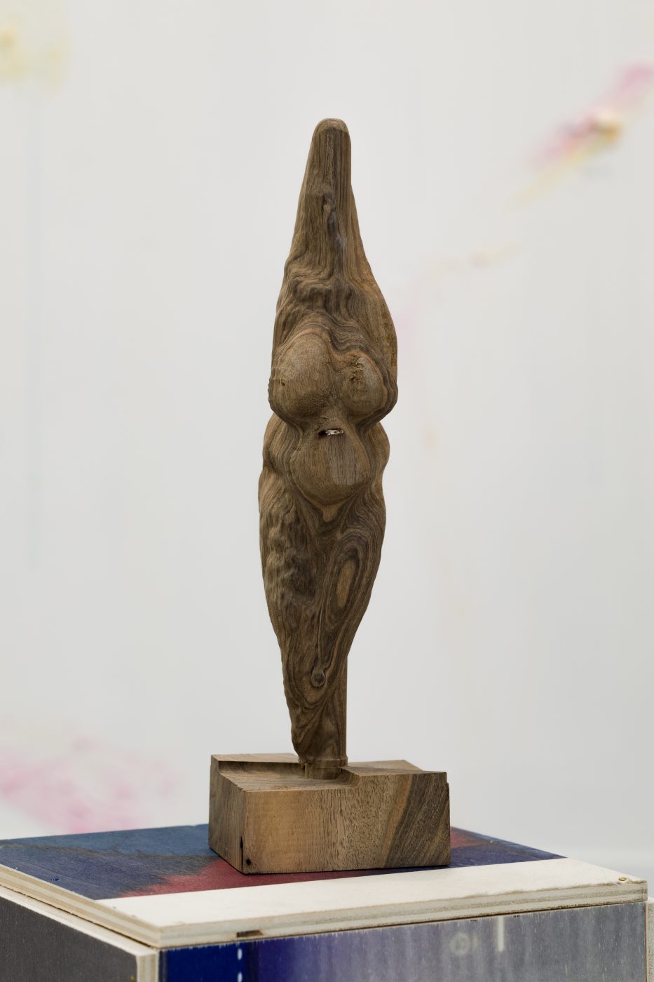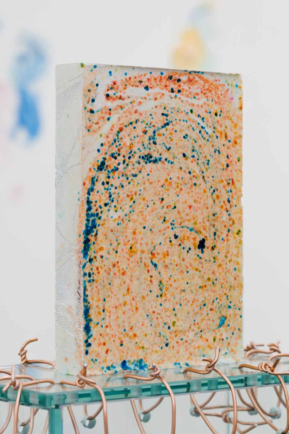 At FRıEZE, Choisne presents five Memoires akashiques [Akashic Records], an ongoing series of sculptures made of acrylic resin and food pigments that the artist first presented at The Fifth New Museum Triennial in 2021. Engraved with figures, plants and medical drawings found in colonial archives, Choisne’s sculptures are named after the Sanskrit term ‘akasha’, which in Hindu philosophy refers to ‘aether’ or ‘atmosphere’. In the 19th century, the term ‘akasha’ was used in the religion of Theosophy to form an esoteric concept designating the ensemble of universal events, thoughts, emotions and intent to have occurred in the past, present, or future, forming a sort of DNA of the universe. Described as the ‘indestructible tablets of the astral light’ by the founder of theosophy H. P. Blavatsky (1831-91), the Akashic Records evoke the inseparability of matter and meaning: that is, how immaterial ideas embed themselves in physical matter and, in turn, how materiality informs the emergence of concepts and thoughts.