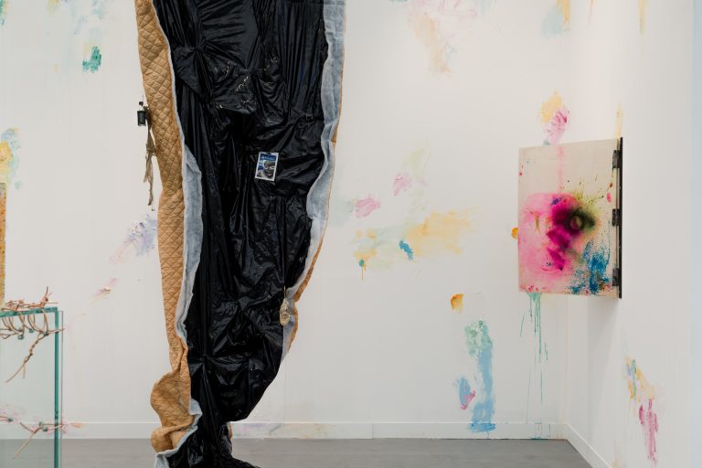 Similar ideas of openness/dissimulation are explored in Some Food for the Afterlife, Blackface (2018), apiece of quilted fabric taking the form of a survival blanket embroidered with objects collected in deserted refugee camps. Conceived as a monument to obliterated lives, Choisne’s textile work is inspired by Cuban artist Carmen Lydia Duric (also know as Hessie, 1936-2017), who created the feminist movement of‘Survival Art’, in which detritus, discarded and everyday objects were used to elaborate tactics of resistance against discrimination, dissolution and loss.