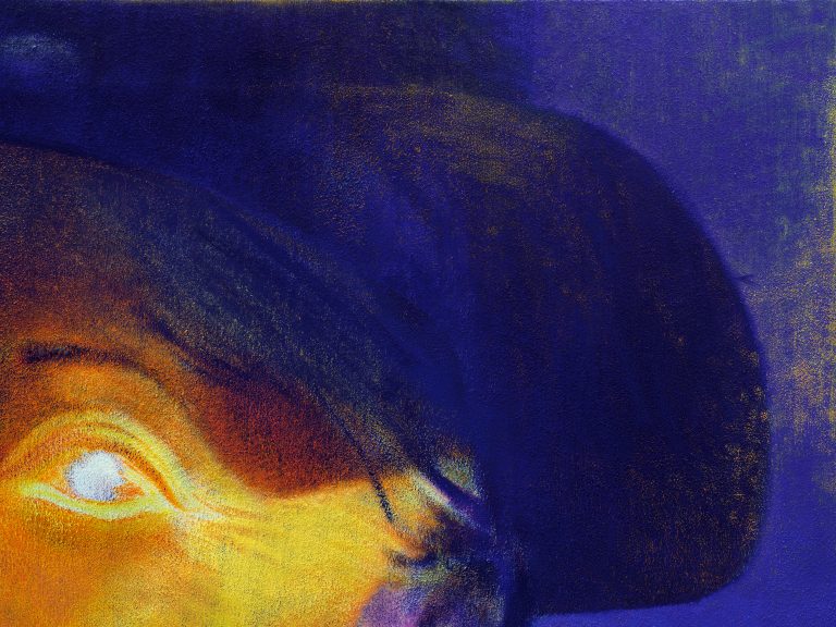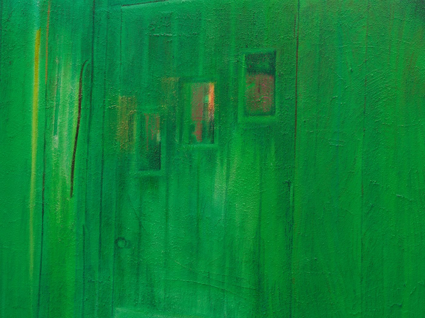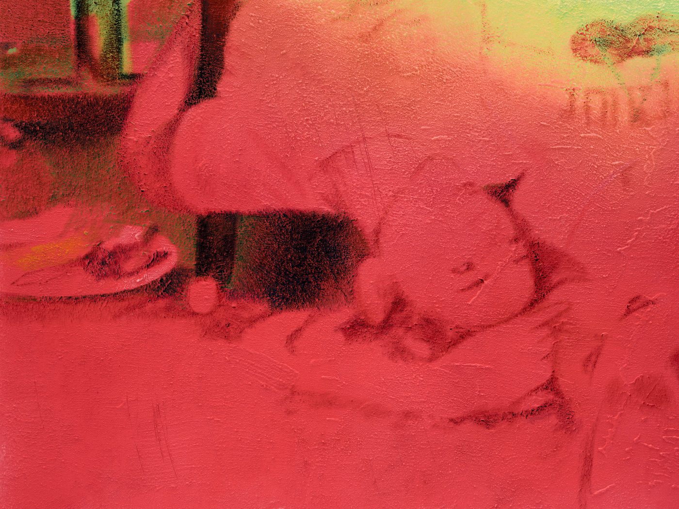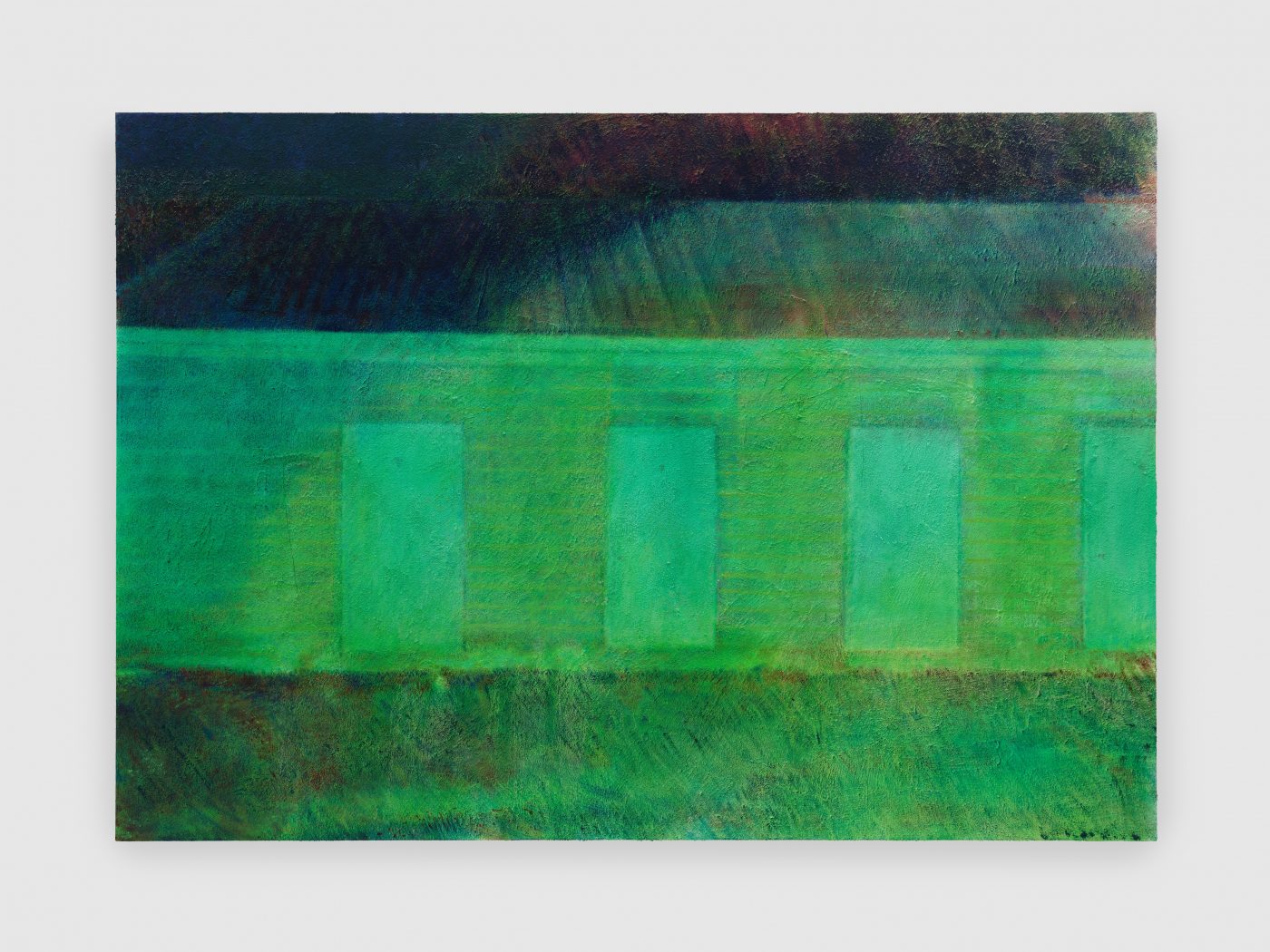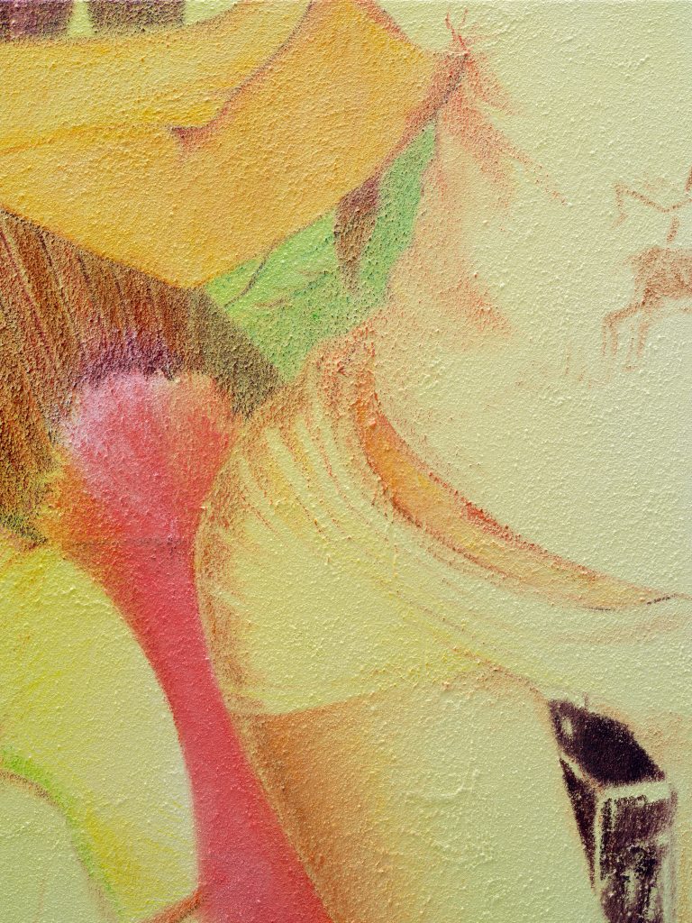 Materially, Wolke’s process reinforces this conceptual layering. Construction sand, often sourced from the filming location itself, is mixed into the gesso to create a granular substrate. Over this textured ground, the artist first applies thin layers of oil paint, emulating the artificial luminosity of staged lighting, before tapping thicker paint onto the surface to mimic the spontaneous, low-resolution aesthetic of nighttime videography. The resulting paintings echo both cinematic composition and tactile immediacy, underscoring the tension between control and rawness that characterises her practice.