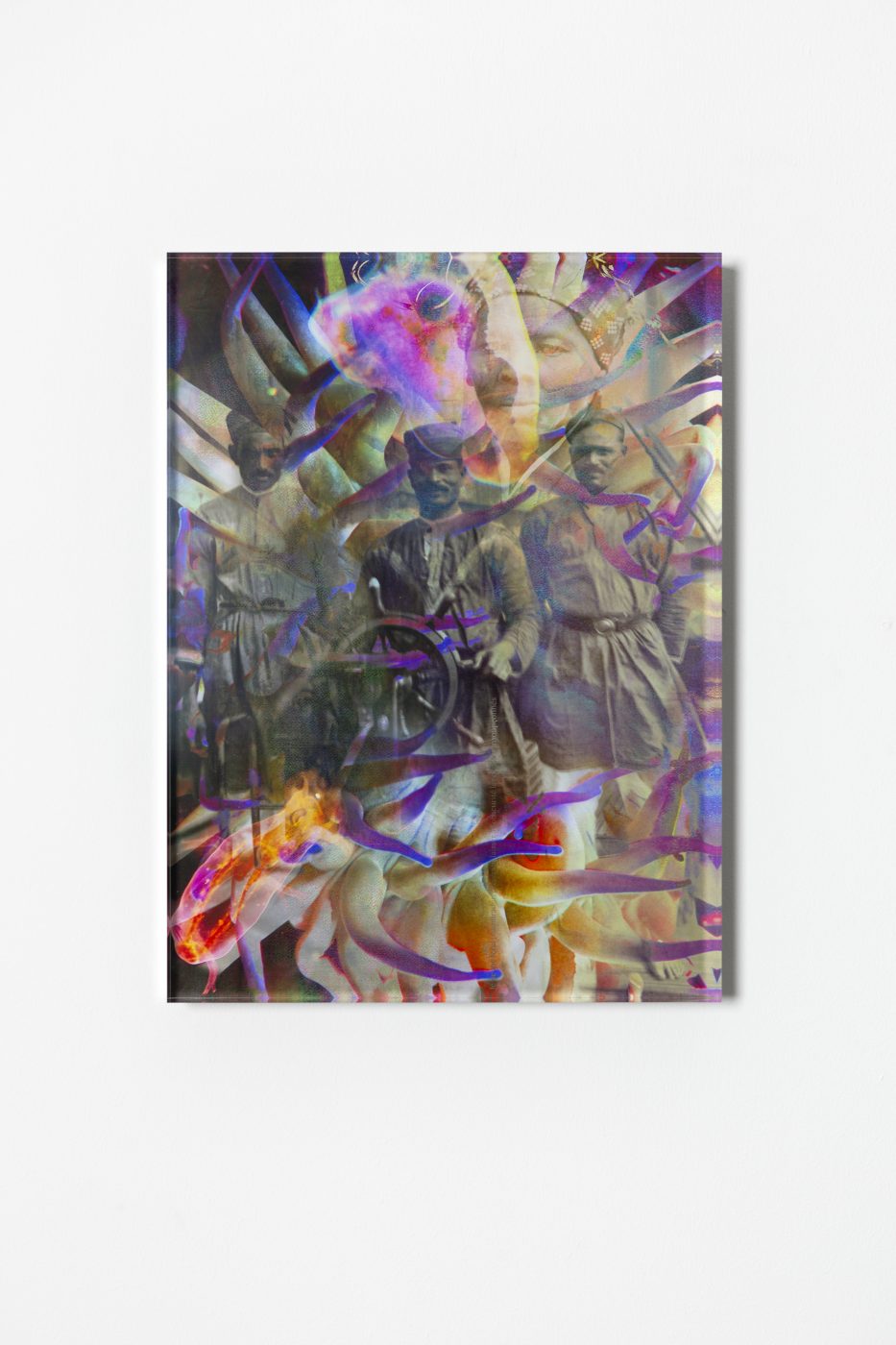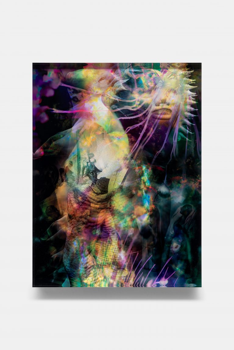 Josèfa Ntjam will present a series of intricate photomontages that revisit colonial history through the lenses of mythology, natural processes, and science fiction. Ntjam’s work merges archival photography with AI-generated imagery and microscopic views of organic materials, creating opulent and layered compositions. Her photomontages, printed on paper and encased in a double perspex bonding, evoke movement and depth, collapsing the micro and macro to draw parallels between historical events and natural phenomena. Through her speculative visual language, Ntjam reimagines the interconnectedness of nature and human resilience, invoking water’s fluidity as a model for resistance and adaptation.